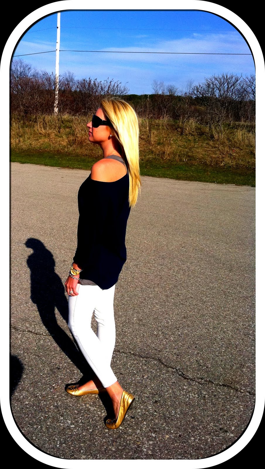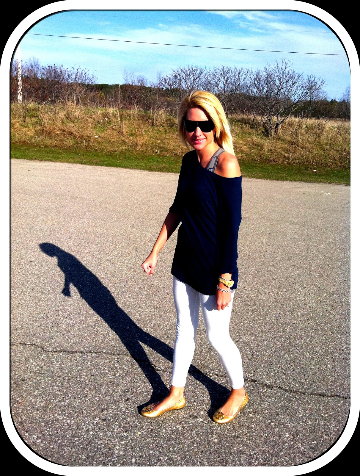 The sun came out today, man was it beautiful. It was still pretty chilly but I did not care. Today I wanted to wear leggings, so I wore my white jeggings, not the same ones as yesterday. I paired that with my favorite Tunic from H&M. I have this tunic in 5 different colors, I am officially obsessed with them all. The one I wore today was Navy. I paired underneath the tunic a striped gray and white tank minidress, you can see it peeking out a couple times here and there. I tossed all of that on with my favorite Tory Burch Reva flats. I probably should of worn more accessories but honestly I just wanted a plain simple look. Very casual and not put together; so the Vogue sunglasses were the accessory for the day. What I was actually missing was a floppy hat or a straw fedora, eh?