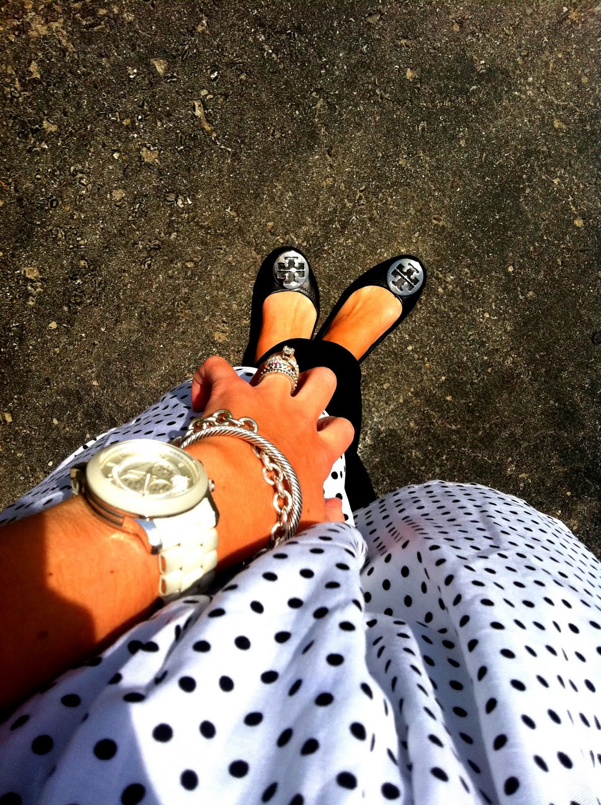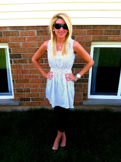What a perfect day for some dots on my dress today. This darling dress is so comfortable and I love it so much for that reason. It has a really cute ruffle line around the neck that makes it so chic as well. I paired it with some regular black stretch leggings and my Tory Burch Reva flats for a fun day in this warm weather. I wore my white and silver jewelry today. I put back on my white Michael Kors watch and accessorised with silver to complete the look.