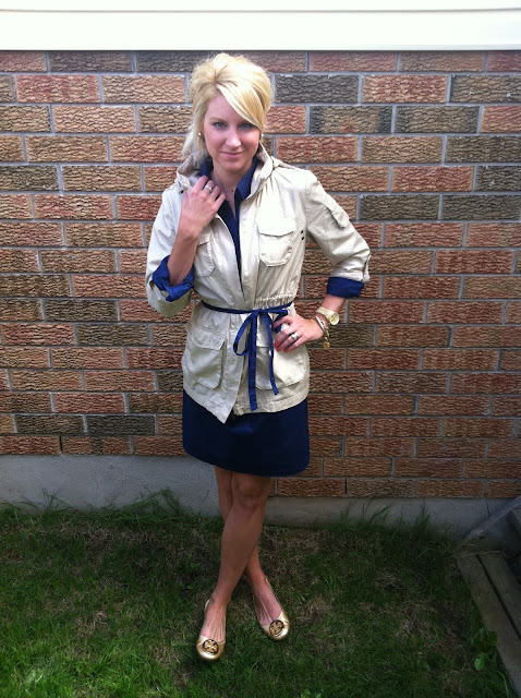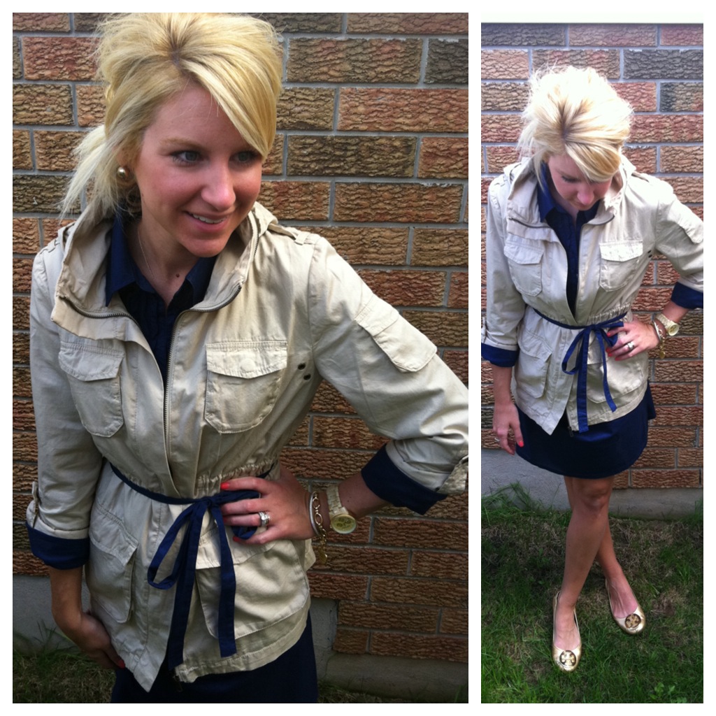 I am not exactly sure on how to describe my outfit today, but I like it. Was a bit cloudy and rainy here, so the hair was a must for a updo. I feel a little safari in this look, is that what you would call it? Tell me, What you think about my outfit today? I wore an Old Navy navy shirt dress with my H&M cargo jacket over it. I also took the belt off the dress and added it to the outside of the coat. I wanted more simplicity today with a little less jewels and my classic Tory Burch gold revas. How do you feel about this look? I can’t wait to hear your thoughts!