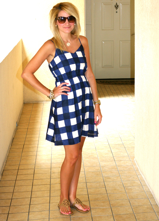 This whole outfit is Fab!!! Love the Navy Gingham with those flats! Also, your hair looks great. 🙂