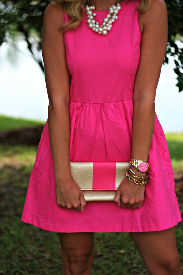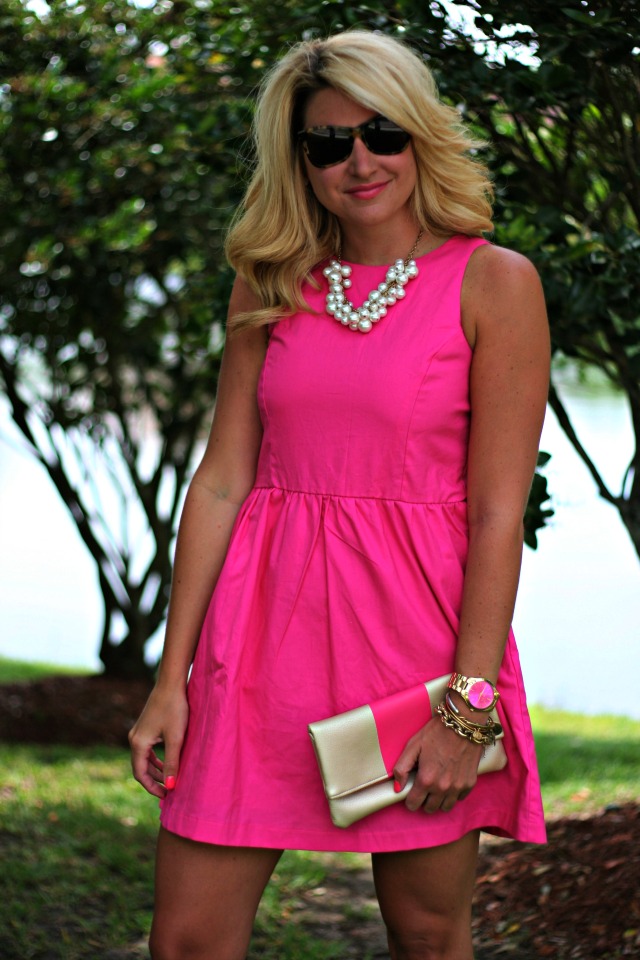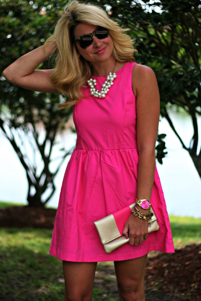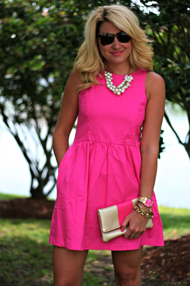 I love this bright pink dress. So cute. The pearl necklace is the perfect finishing touch.