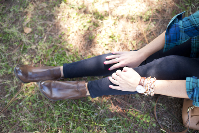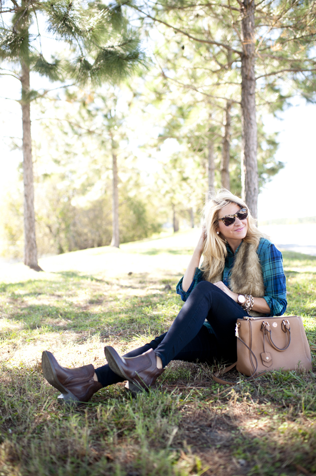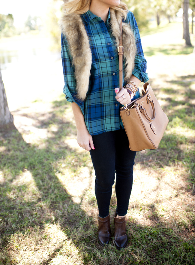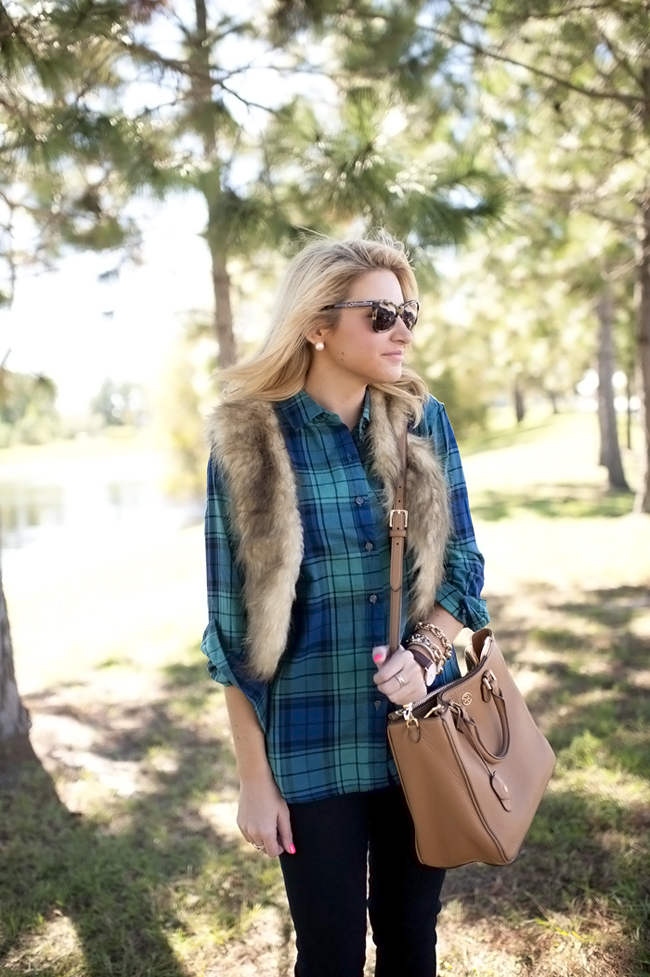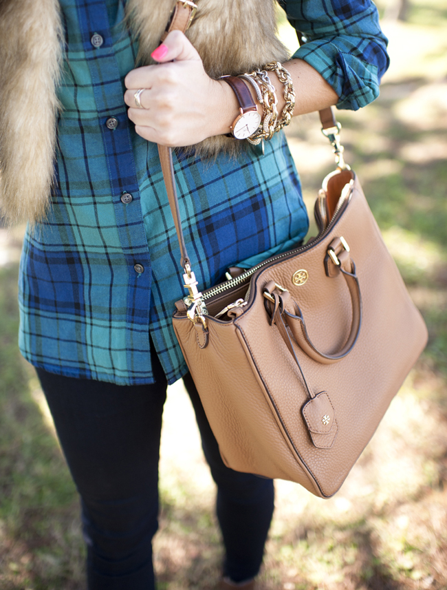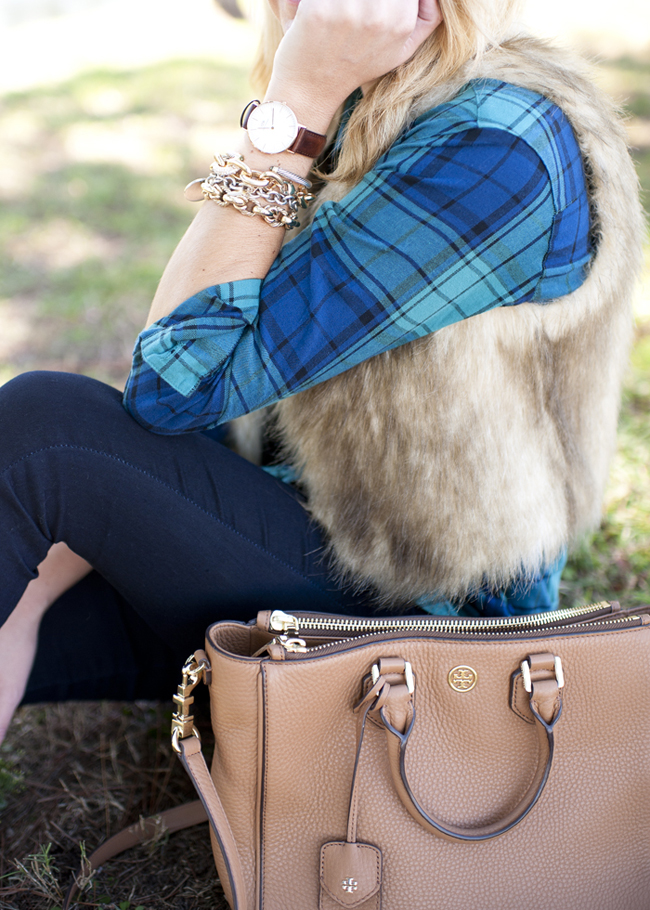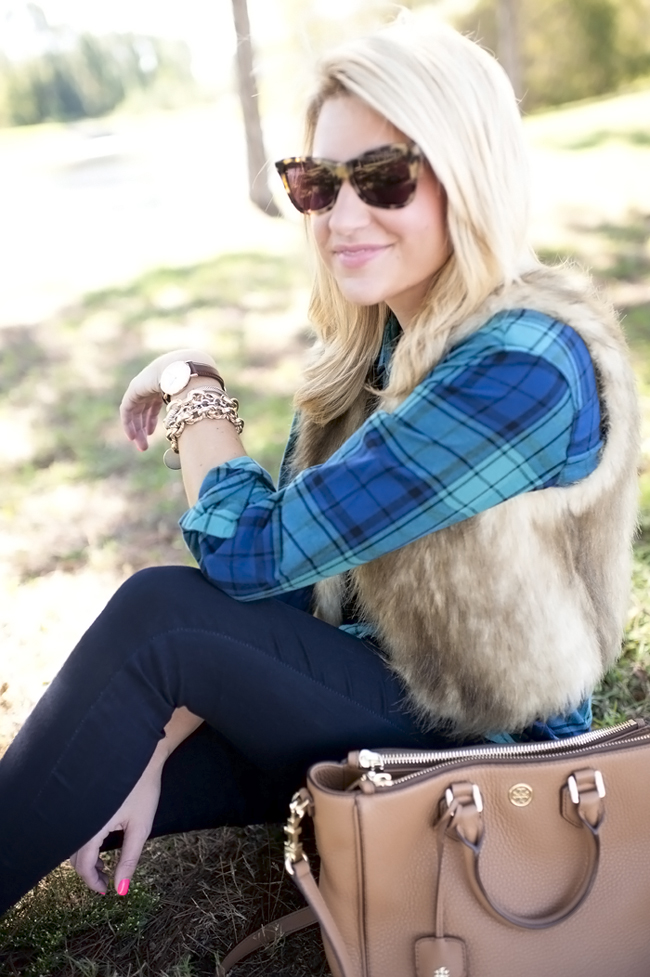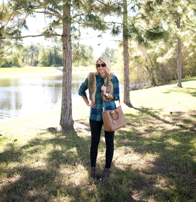 Tunic : Old Navy Plaid Flannel Boyfriend Shirt only $24 some shades are $15 | Fur Vest : ChicWish Faux Fur Vest in Camel (I am in the short version on the listing) | Bottoms : Jeggings | Boots : BC Footwear Ground Floor Booties | Sunglasses : Karen Walker | Bag : Tory Burch Robinson Square Tote | Watch : Daniel Wellington Classic St. Andrews c/o {15% off with code JUSTDANDY at checkout} | Bracelets : Bauble Bar Alex Ani | David Yurman | Nordstrom | Earrings : Double Pearl 360 Studs | Rings : David Yurman