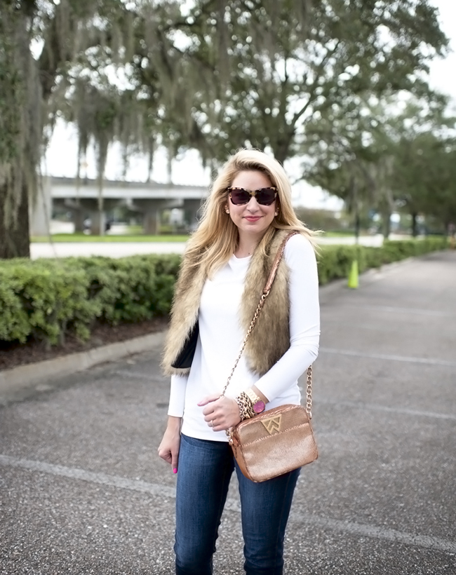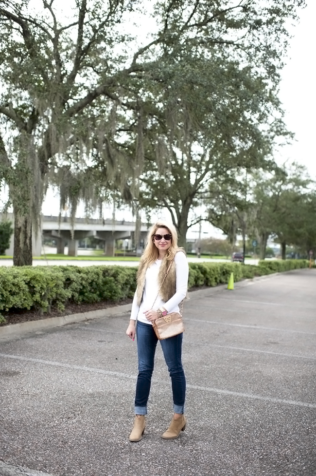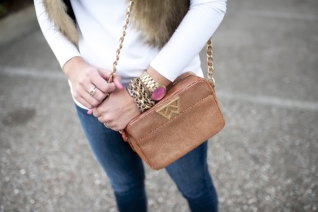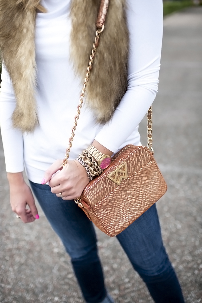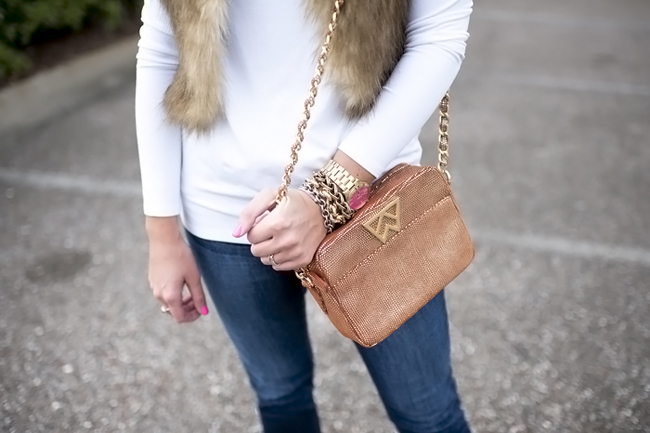 Top : Long Jersey Tunic via Nordstrom | Faux Fur Vest : ChicWish Faux Fur Vest in Camel (I am in the short version on the listing) c/o | Similar Boots : BP Trolley Boot in Tan (originals are sold out) | Bag : Kelly Wynne Mingle Mingle Handbag c/o | Michael Kors Pink Watch | Nars Lip Gloss | Bracelets : Alex Ani | David Yurman | Nordstrom | Rings Skylen Ring | David Yurman