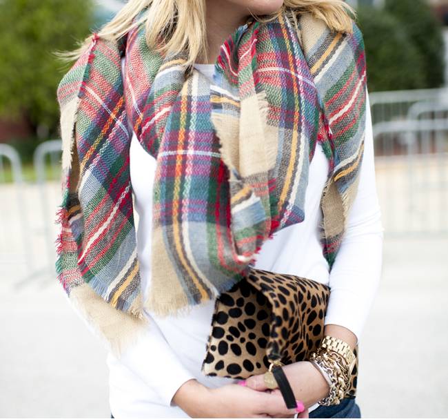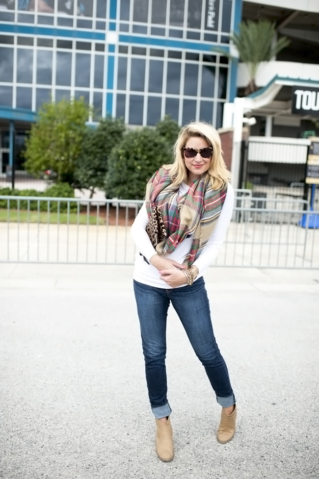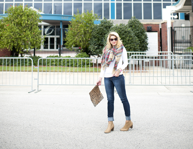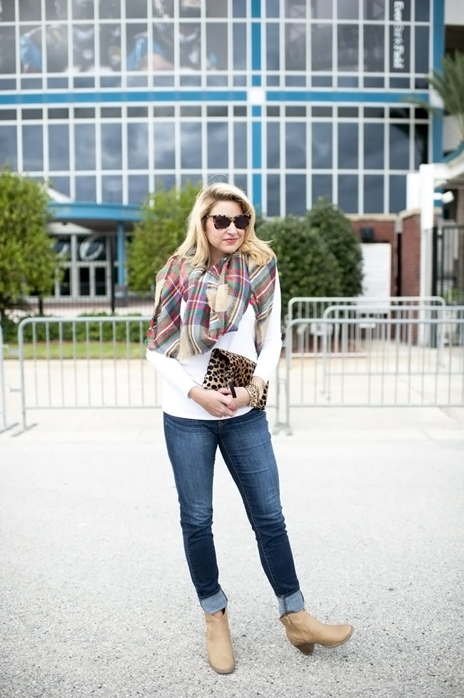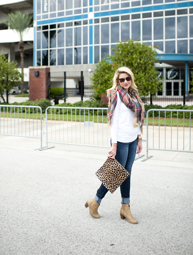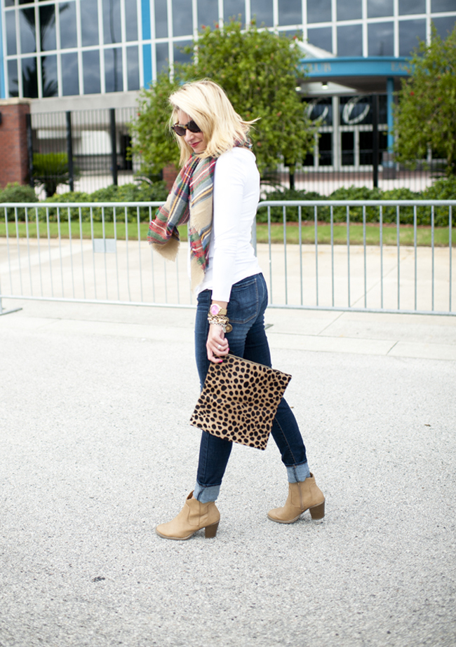 Top : $32 White Tee via Nordstrom | Jeans : Nordstrom 7 for all Mankind Skinny Jeans (I size up for a looser fit and to cuff them) | Scarf : Plaid Scarf and $16 Target Option Plaid Scarf | Boots : BP Trolley Boot in Tan | Bag : Clare Viver Leopard Foldover Clutch | Michael Kors Pink Watch | Nars Lip Gloss | Bracelets : Alex Ani | David Yurman | Nordstrom | Rings Skylen Ring | David Yurman