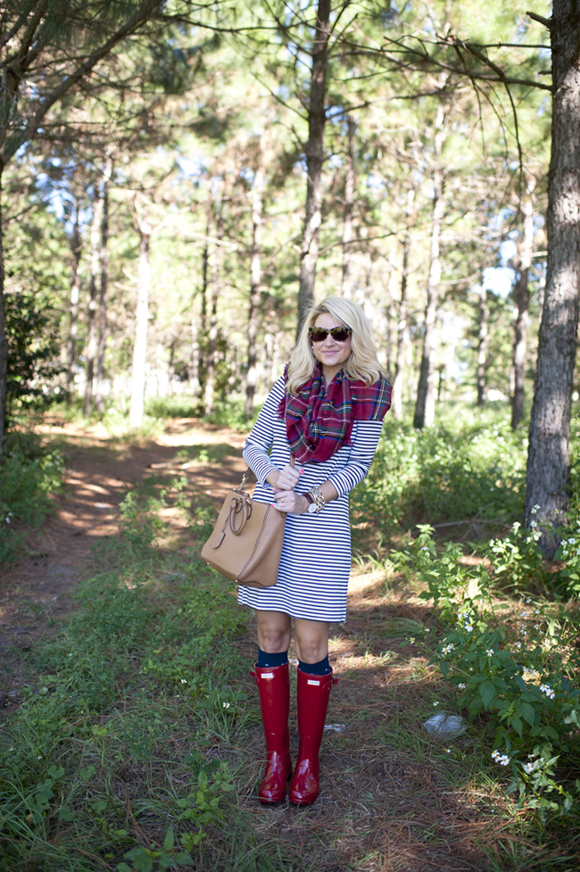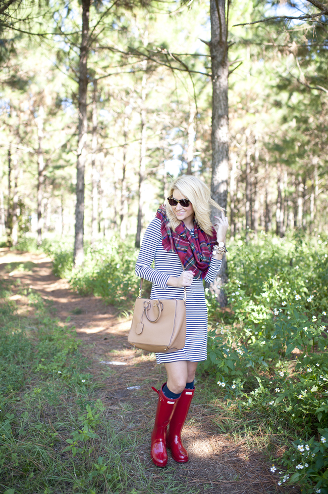 Outfit | Stripe Dress + Plaid + Hunter Boots