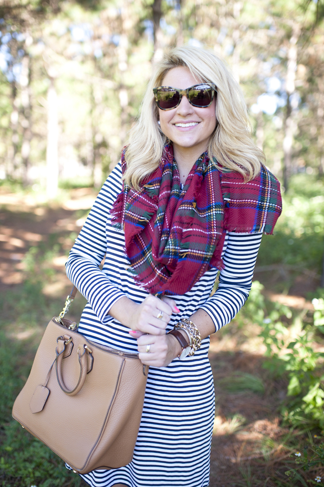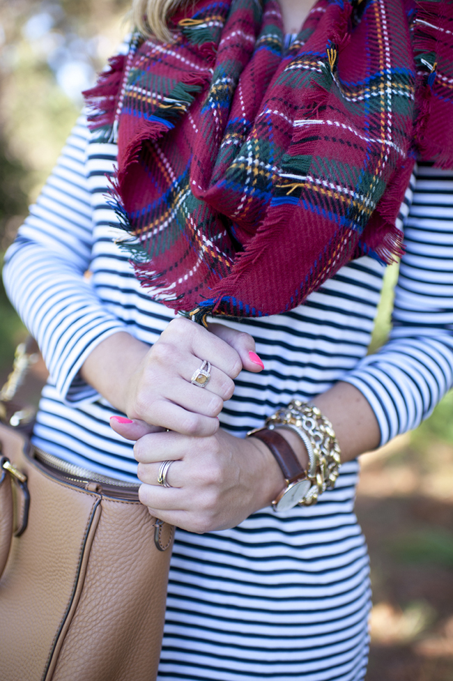 Dress : Mott Sun Protective Stripe Dress c/o | Scarf : Red Oversized Plaid Scarf (only $16) | Boots : Red Original Tall Gloss Hunter Boots | Socks : Polka Dot Over The Knee Socks $12 | Sunglasses : Karen Walker | Bag : Tory Burch Robinson Square Tote | Watch : Daniel Wellington Classic St. Andrews c/o {15% off with code JUSTDANDY at checkout} | Bracelets : Bauble Bar Alex Ani | David Yurman | Nordstrom | Earrings : Double Pearl 360 Studs | Rings : David Yurman