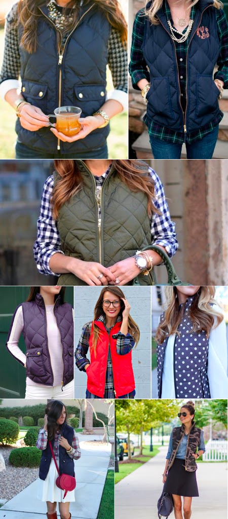 The quilted vest has become a huge staple in fall wardrobes over the last 2 years. So many stores have caught on with the trend and have made them in almost every color and print. A couple of my favorite stores that carry them are J.Crew, Old Navy, Gap, and Lands End