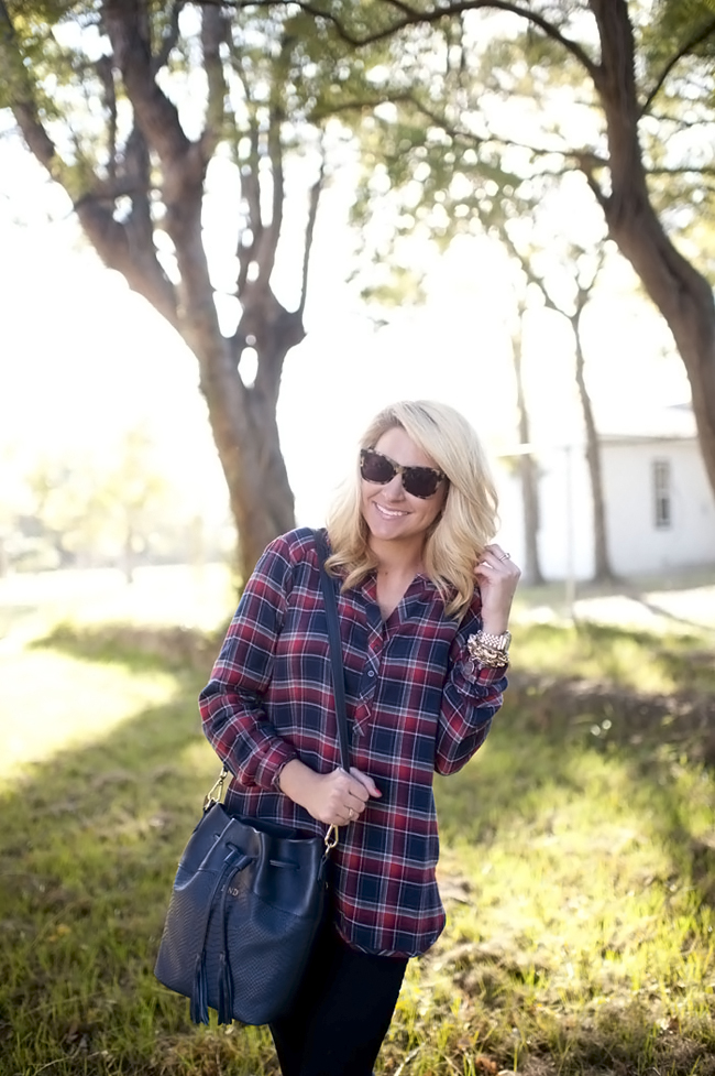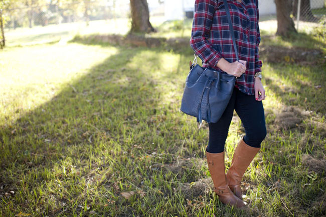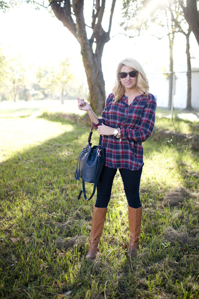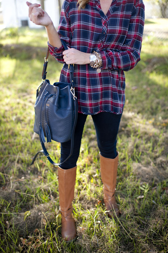 Top : Ace Delivery Check Henley Tunic | Pants : Nordstrom Jeggings | Similar Boots : Riding Boot (exact style sold out) | Sunglasses : Karen Walker | Bag : Jenn Bucket Bag Navy Embossed Python c/o (This would make an awesome Christmas present and also comes in a ton of amazing color shades. I also love that you can wear it on your shoulder, cross body, and via hand strap.) | Bracelets : Bauble Bar Alex Ani | David Yurman | Nordstrom | Earring : Double Pearl 360 Studs | Rings : David Yurman