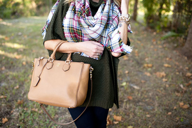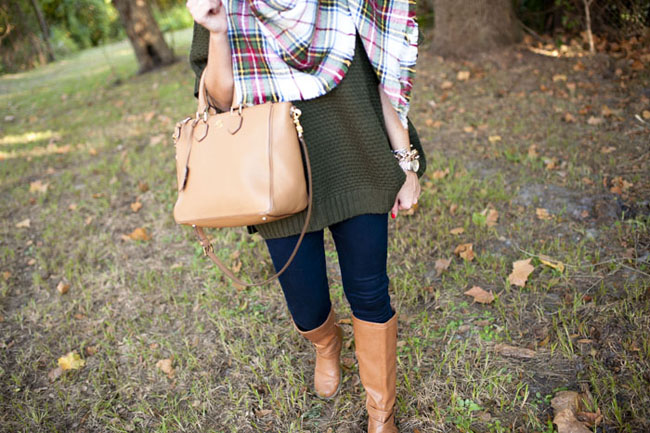 Top  :  Forever 21 Turtleneck Poncho Sweater   |   Scarf :  Heritage Plaid Blanket Scarf   |   Pants :  Nordstrom Jeggings   |  Similar Boots : Riding Boot   (exact style sold out)  |   Sunglasses : Karen Walker  |    Bag :  Tory Burch Robinson Square Tote  |  Bracelets : Bauble Bar Alex Ani | David Yurman | Nordstrom  |  Earring : Double Pearl 360 Studs  |  Rings : David Yurman