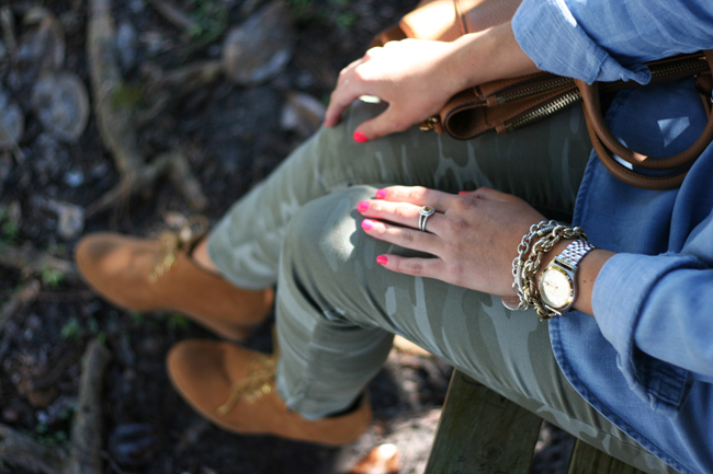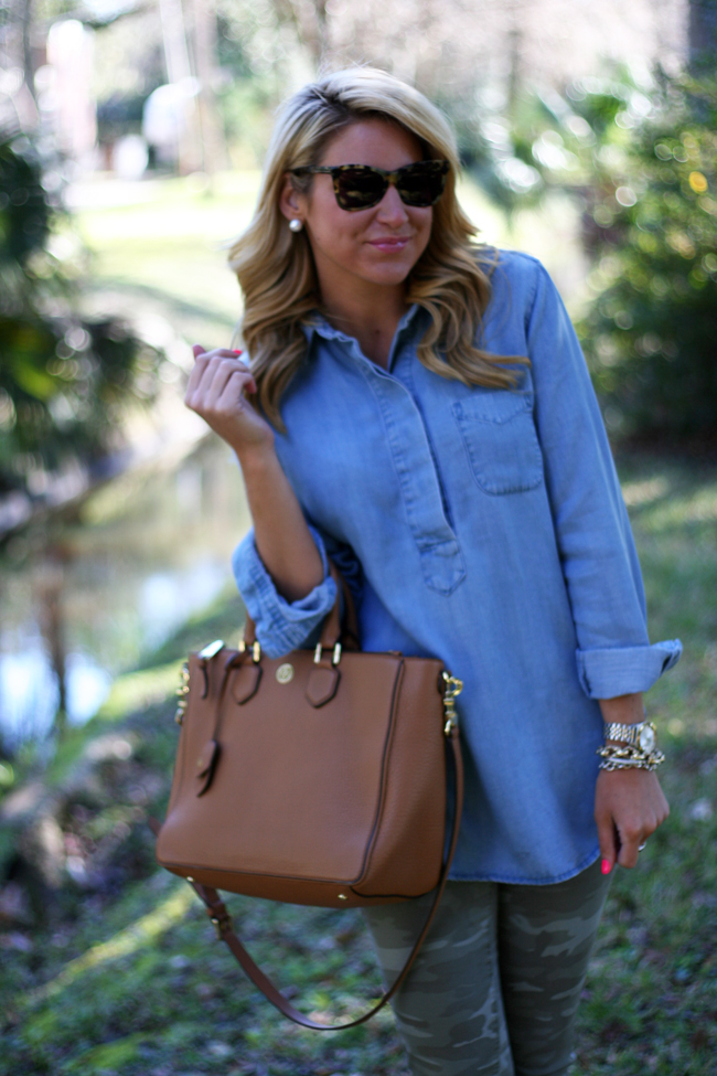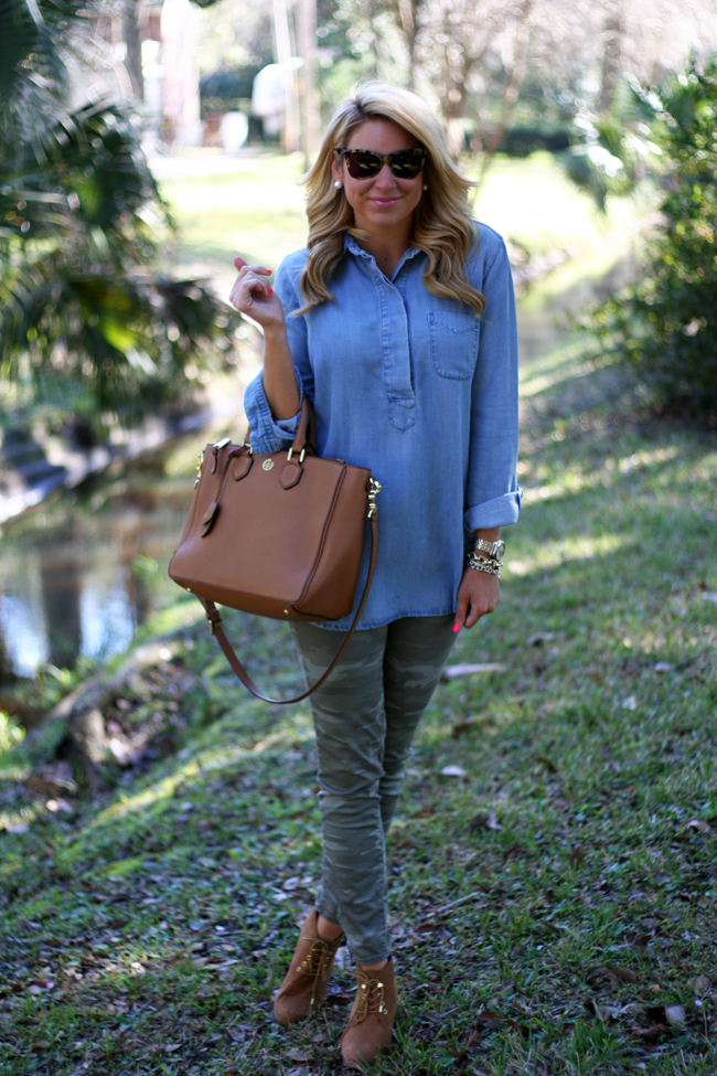 Top  :  Loft Lapeled Light Chambray Softened Shirt   |  Pants :  Loft Curvy Skinny Ankle Zip Jeans in Desert Camo   |  Flats : Lace Up Wedge Boot     |    Sunglasses :  Karen Walker     |    Bag  :   Tory Burch Robinson Tote    |  Bracelets : Bauble Bar Alex Ani | David Yurman | Nordstrom     Earring : Double Pearl 360 Studs  |  Rings : David Yurman