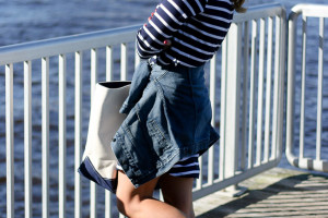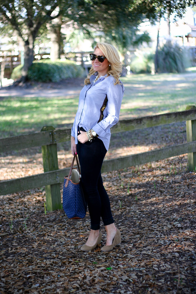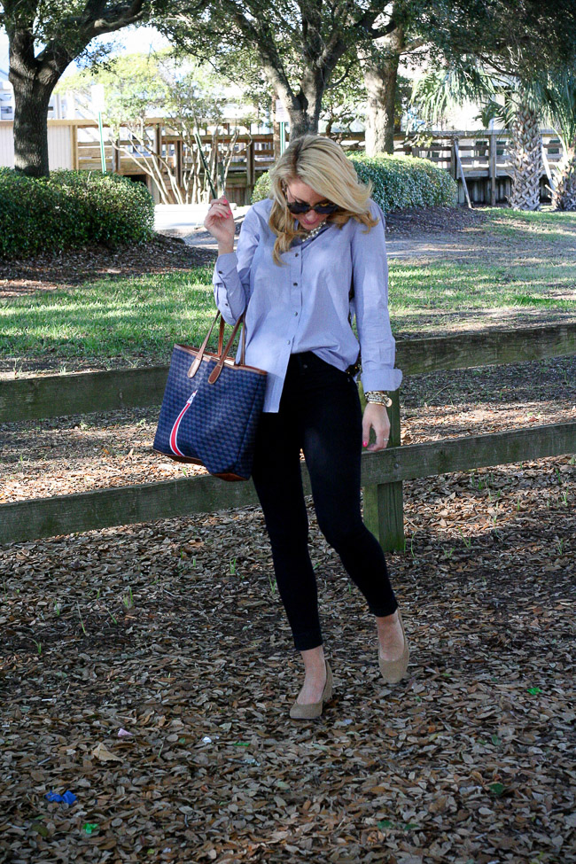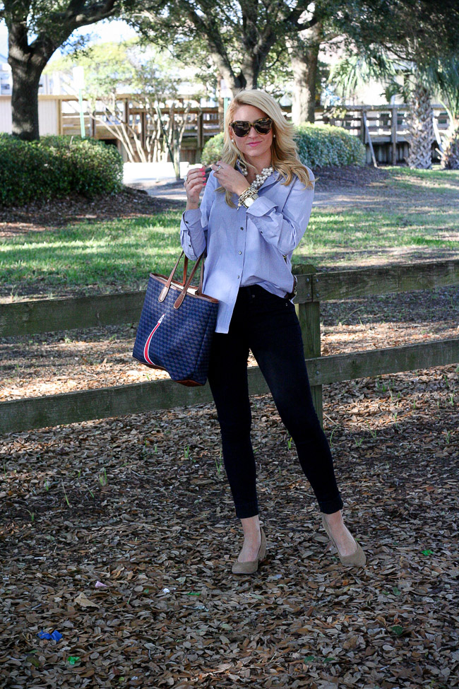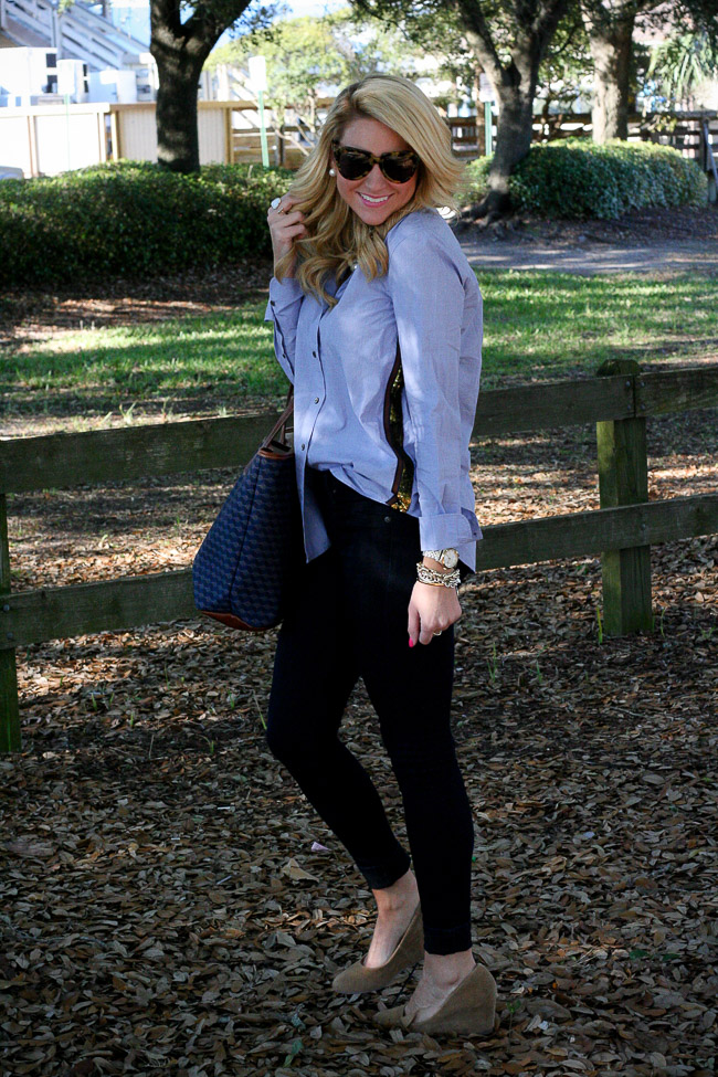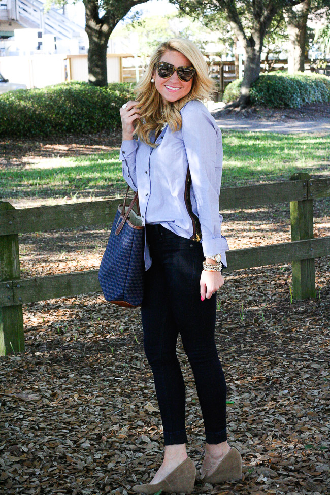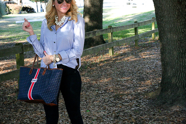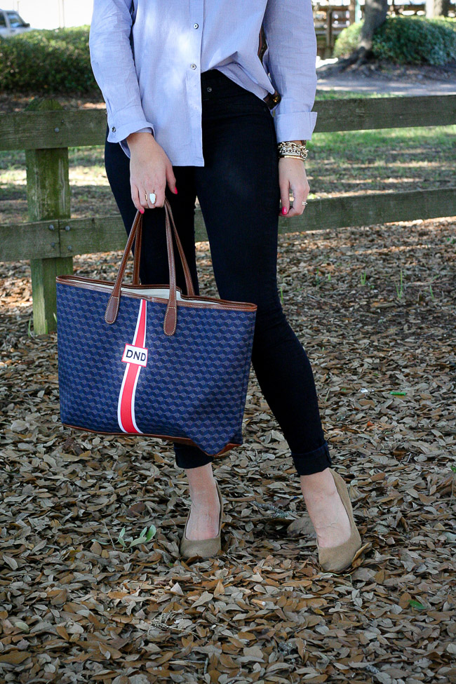 Top : J.Crew Gold side-stripe popover Pants : Rag&Bone Plush Twill Jegging in Indigo | Shoes : ‘Darby’ Covered Wedge Almond Toe Pump | Sunglasses : Karen Walker Bag : Barrington The St. Anne Tote – Monogram Stripe | Bracelets : Bauble Bar Alex Ani | David Yurman | Nordstrom Earring : Double Pearl 360 Studs | Rings : David Yurman