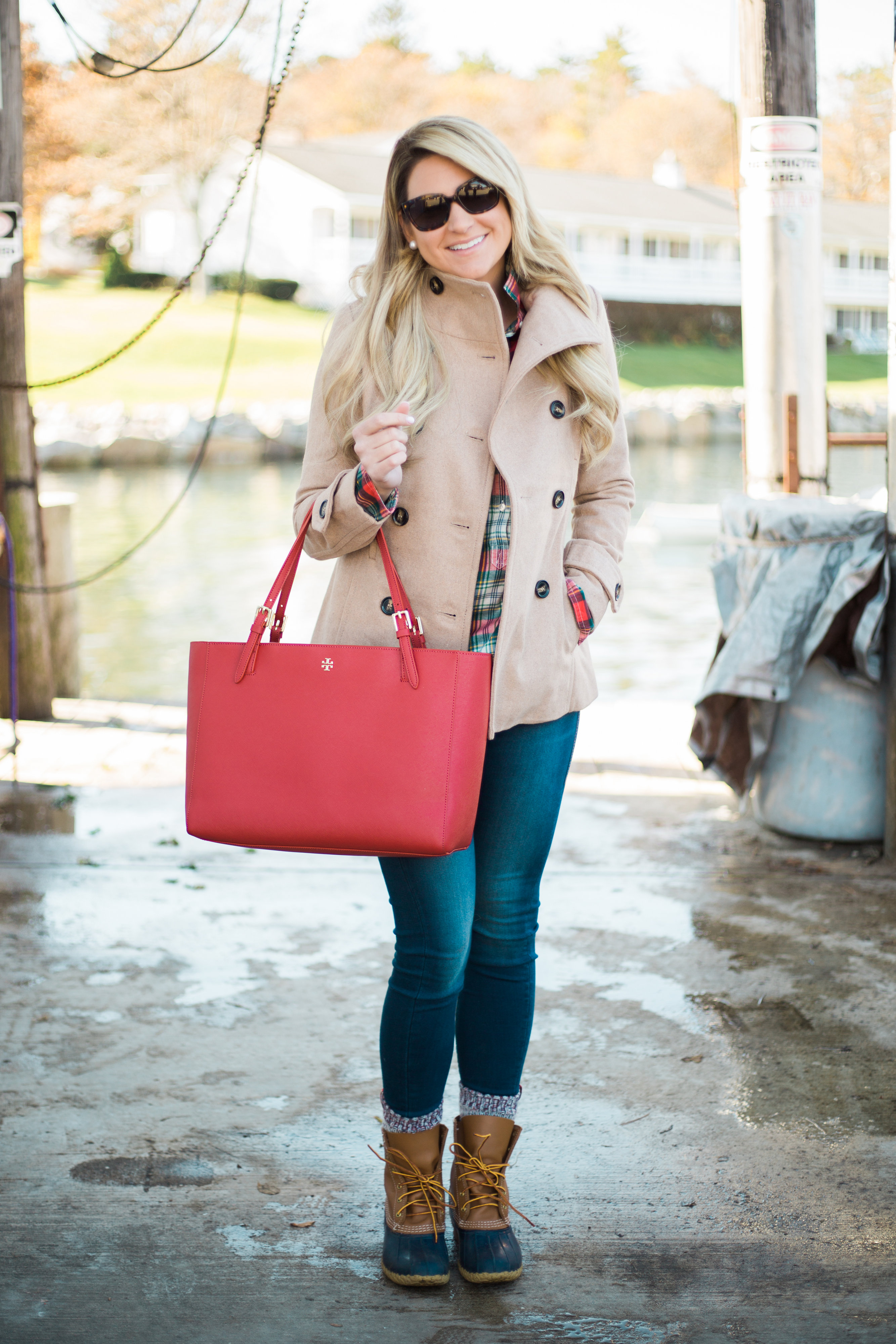 Jeans : Women’s True Religion Brand Jeans ‘Runway’ Leggings | Shirt : J.Crew plaid popover shirt in flannel | Coat : Women’s Thread & Supply Double Breasted Peacoat, | Boots : L.L. Bean Boot in Tan/Navy | Bag : Tory Burch York Tote in Red | Sunglasses : Prada 56mm Sunglasses | Bracelets : David Yurman | Nordstrom | Watch : Daniel Wellington Watch | Earring : Pearl Stud | Ring : David Yurman Ring & Bauble Bar