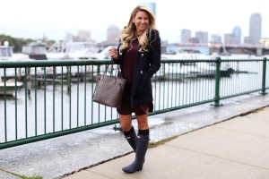Dress : Clu Long Sleeve Ruffle Hem Dress | Scarf : Plaid Fringe Scarf | Boots : Hunter Tall Gloss Boot in Military Red | Socks : J.Crew Wool Sock | Bag : Louis Vuitton Neverfull | Sunglasses : Prada 56mm Sunglasses | Bracelets : David Yurman | Nordstrom | Watch : Daniel Wellington Watch | Earring : Pearl Stud | Ring : David Yurman Ring & Bauble Bar