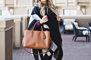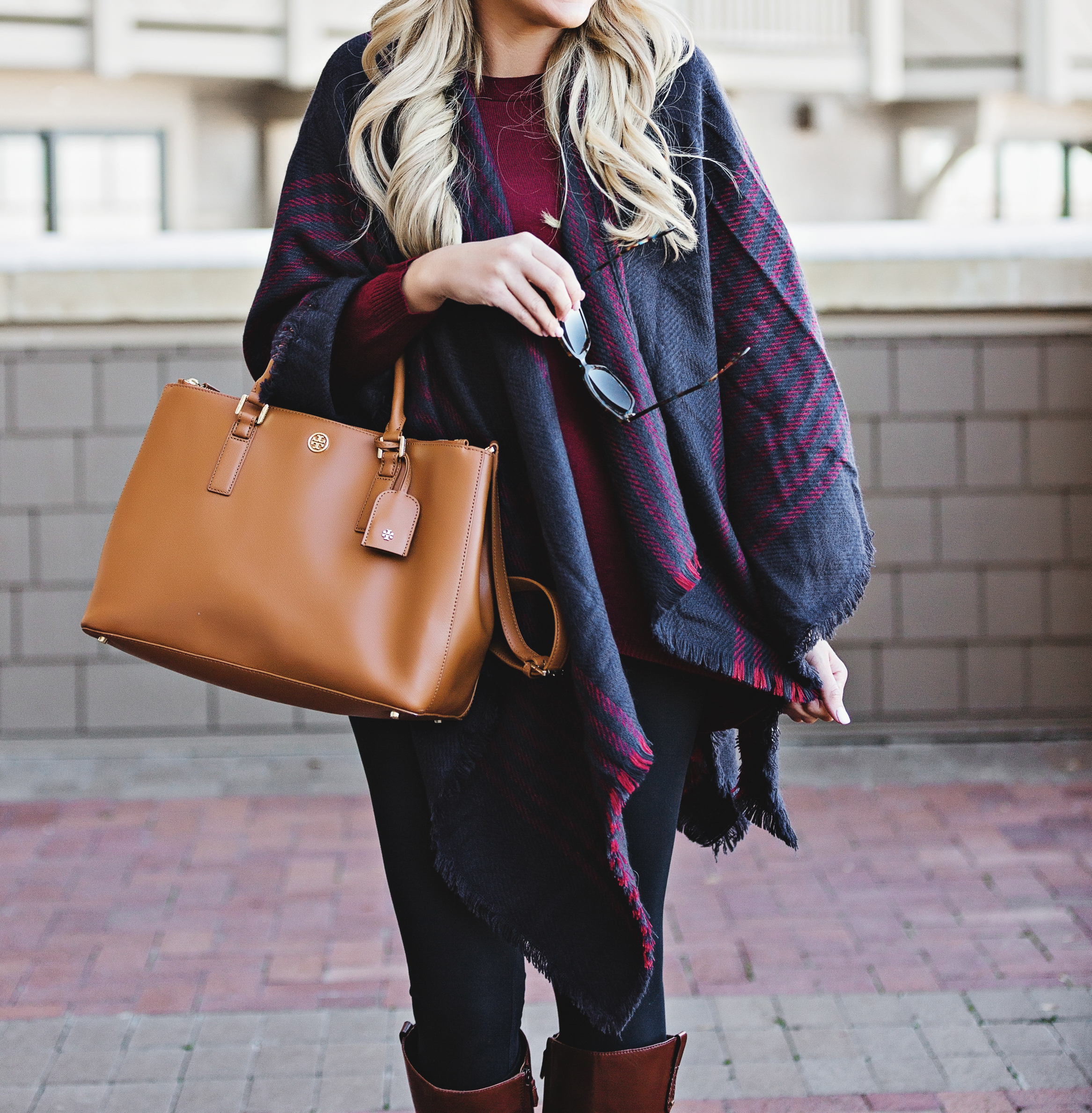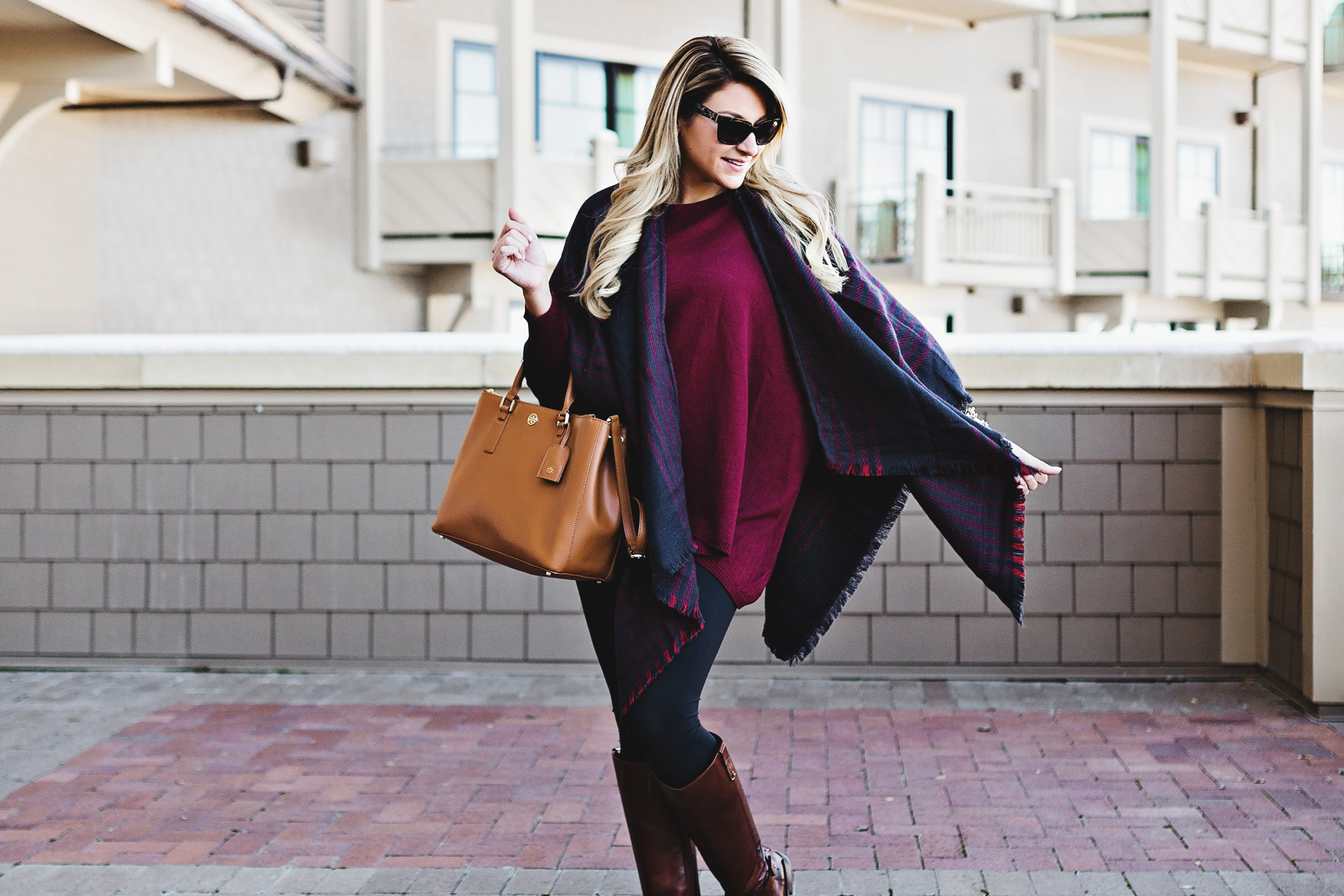 Legggings : Nordstrom Zella Live In Leggings | Tunic : Boohoo Ella Oversized Asymmetric Jumper | Poncho : Nordstrom BP Stripe Poncho | Boots : Tory Burch Derby Riding Boot | Bag : Tory Burch Robinson Double Zip Tote | Sunglasses : Prada 56mm Sunglasses | Bracelets : David Yurman | Nordstrom | Watch : Daniel Wellington Watch | Earring : Pearl Stud | Ring : David Yurman Ring & Bauble Bar