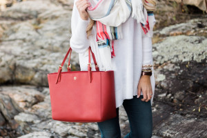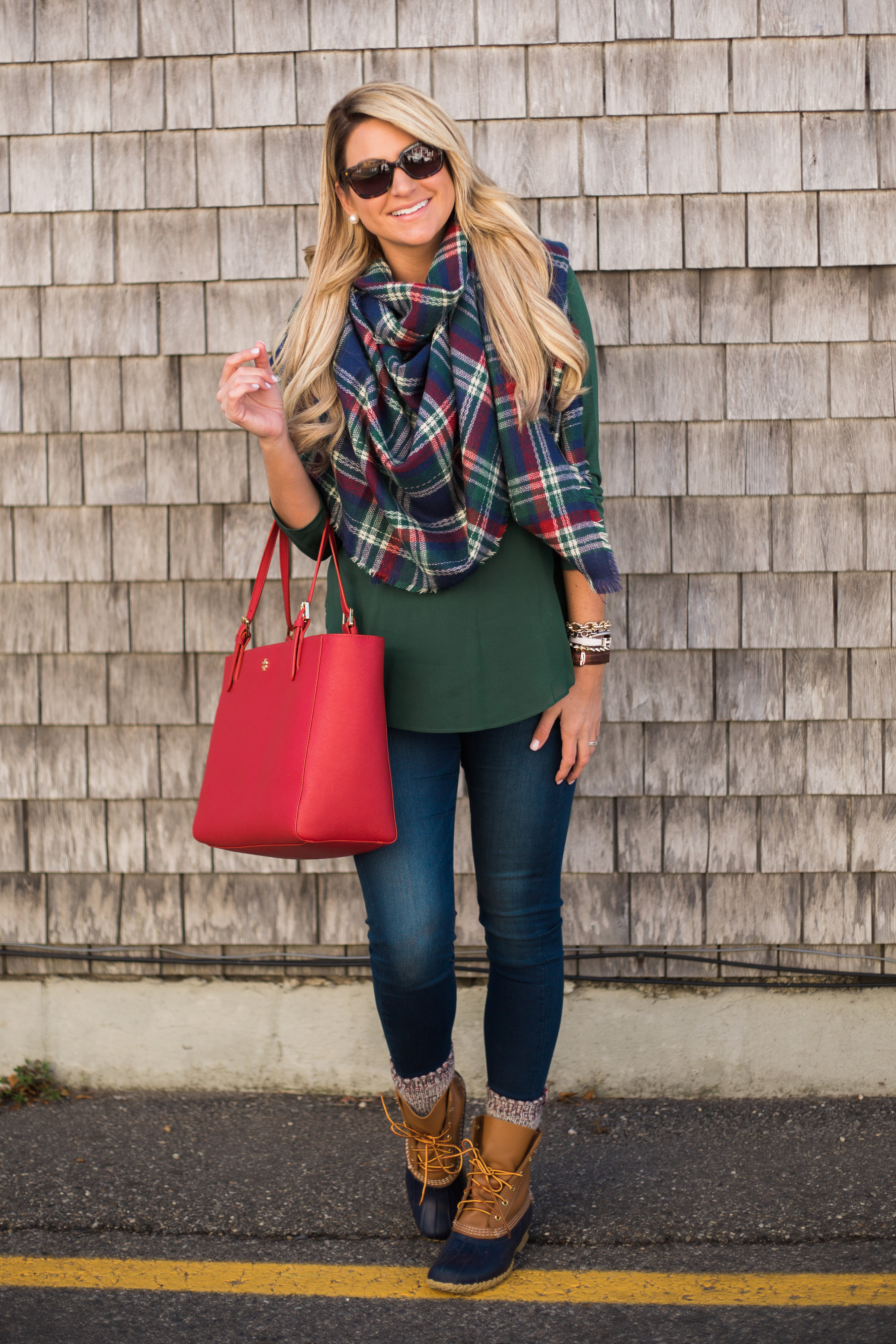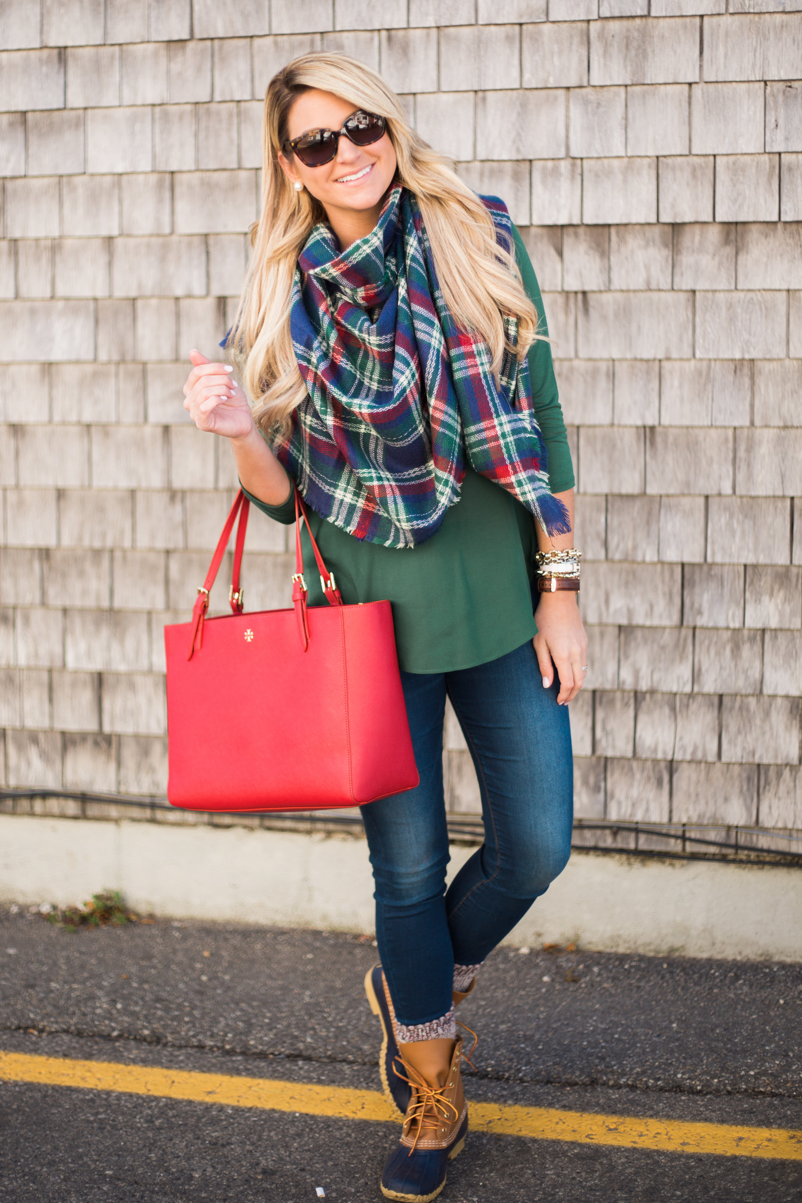 Jeans : Women’s True Religion Brand Jeans ‘Runway’ Leggings | Shirt : Women’s Two by Vince Camuto Mixed Media Crewneck Tunic | Scarf : Sole Society Christmas Plaid Blanket Scarf | Boots : L.L. Bean Boot in Tan/Navy | Bag : Tory Burch York Tote in Red | Sunglasses : Prada 56mm Sunglasses | Bracelets : David Yurman | Nordstrom | Watch : Daniel Wellington Watch | Earring : Pearl Stud | Ring : David Yurman Ring & Bauble Bar