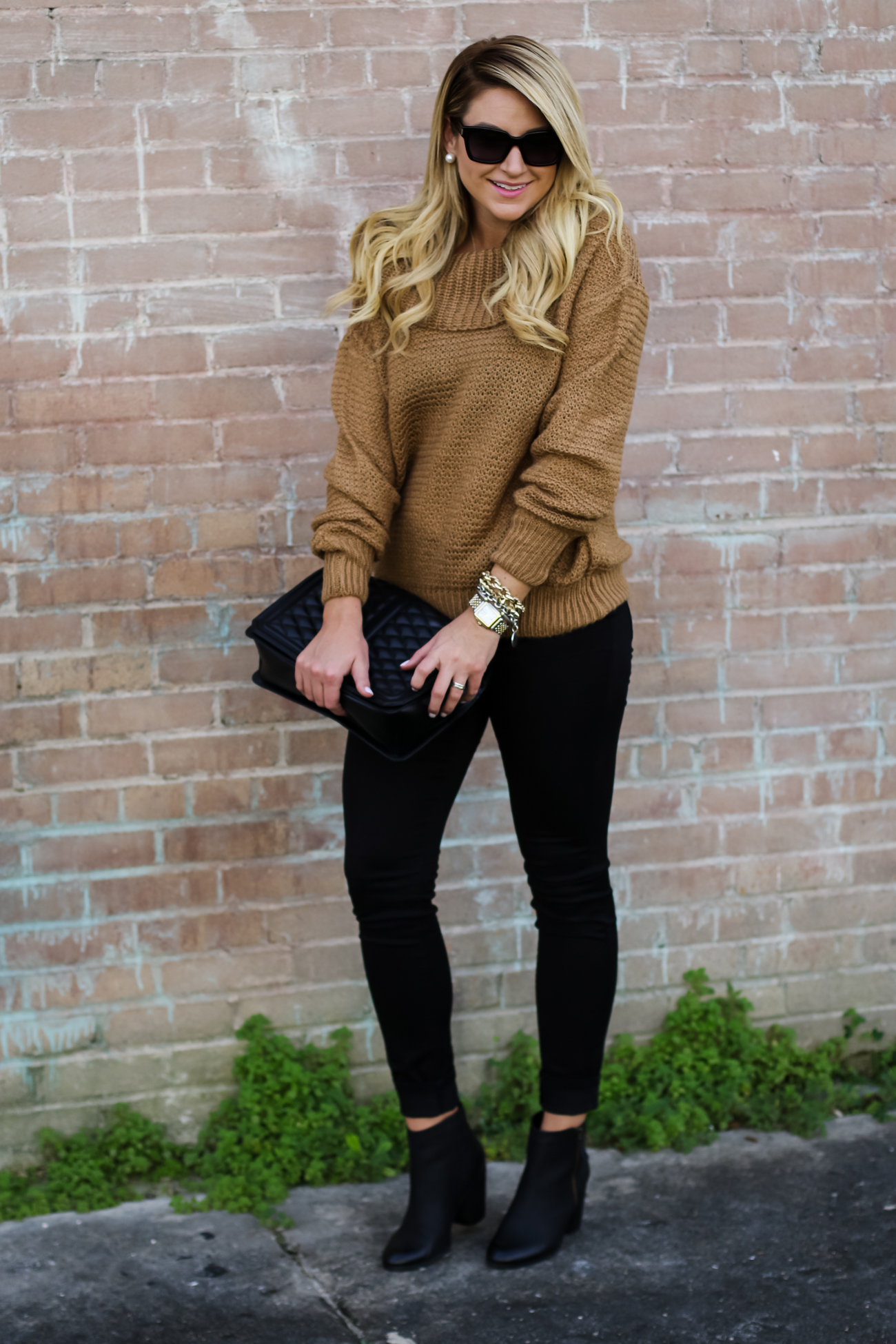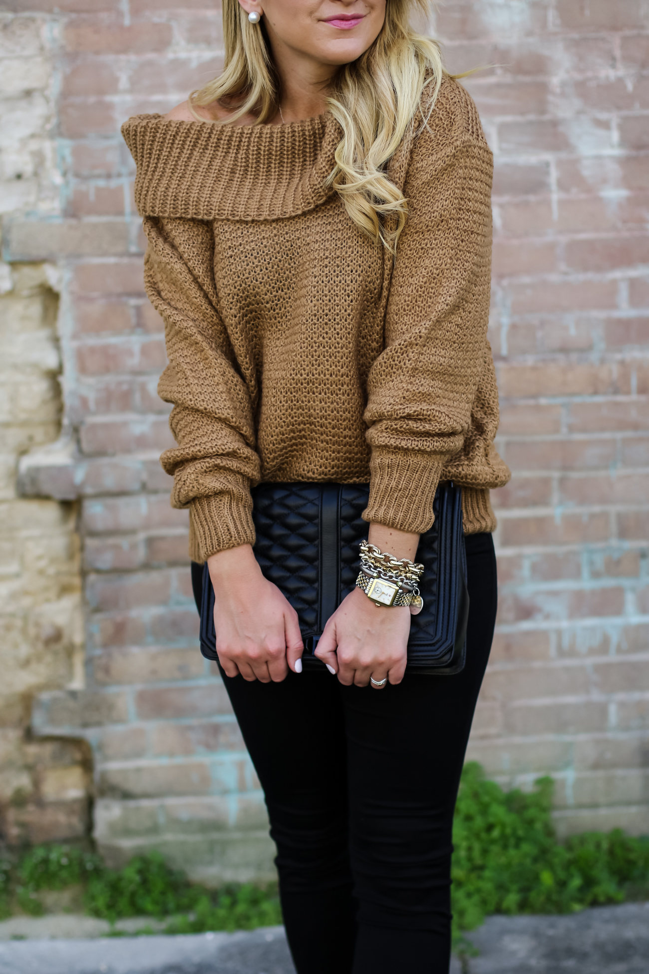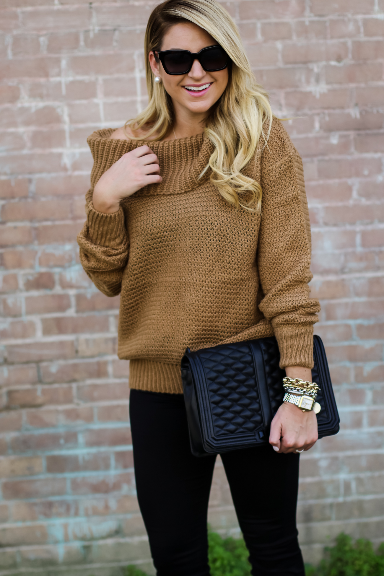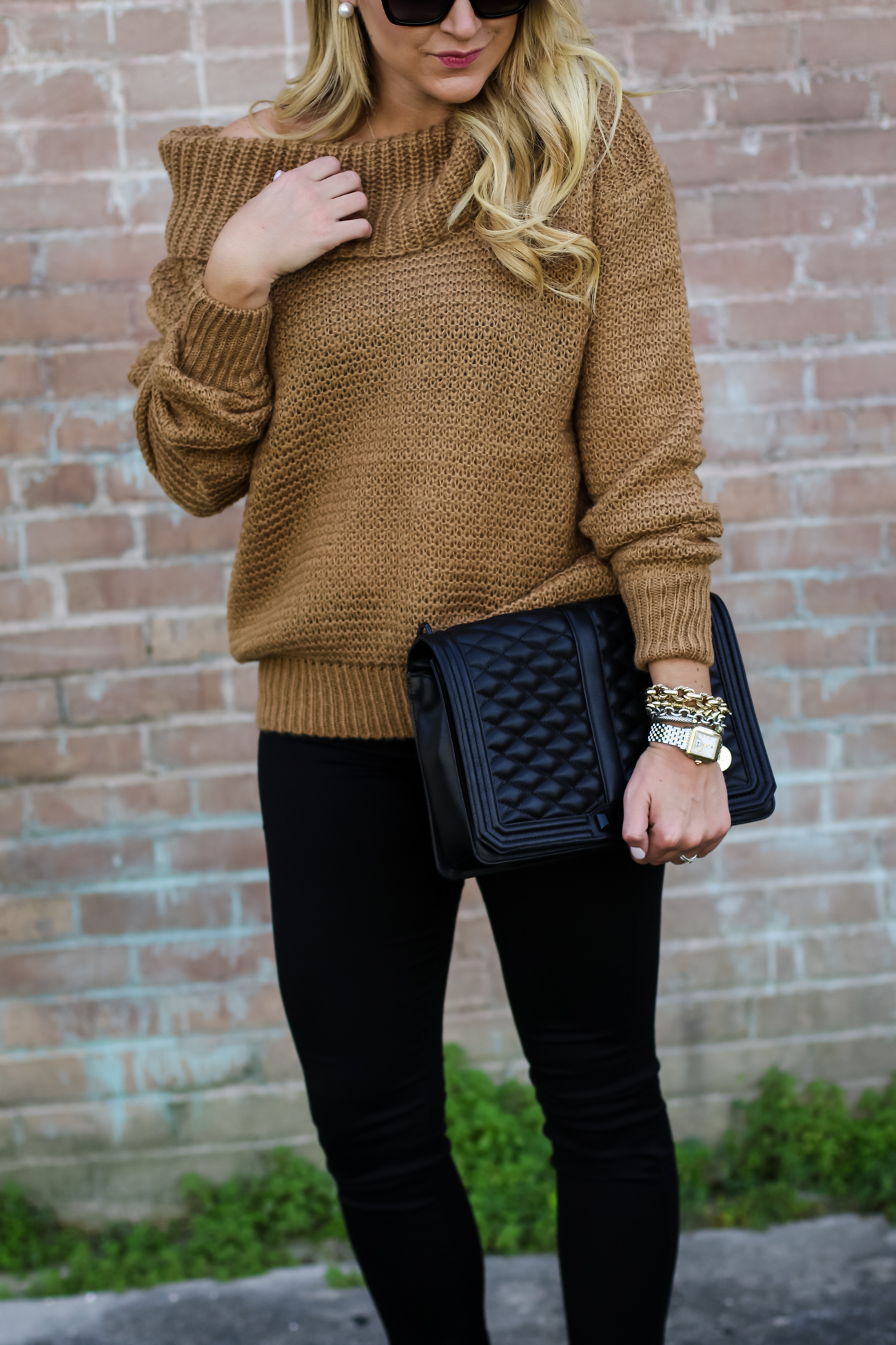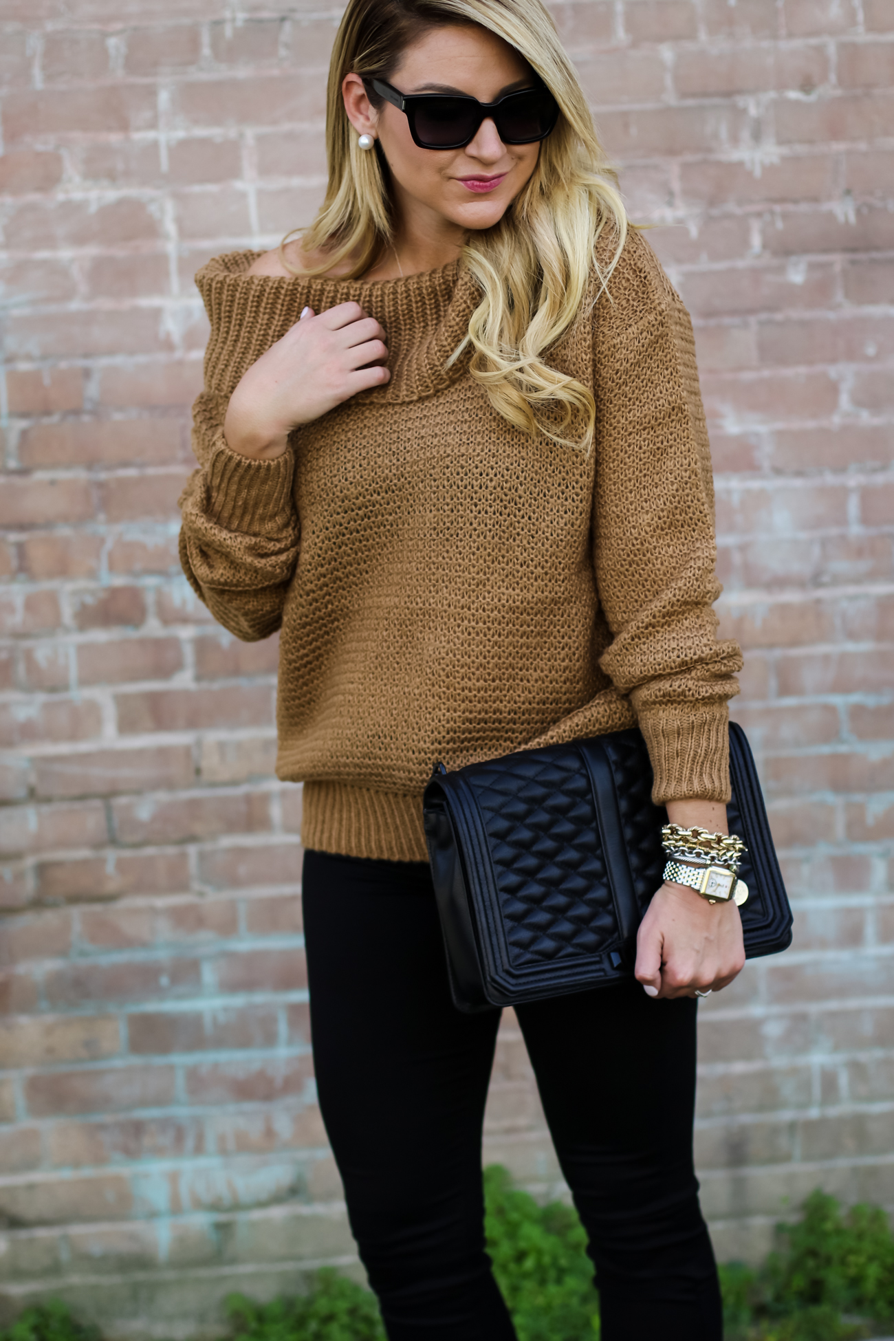 Pants :  Rag & Bone Black Jean Legging   |   Top :  Chicwish Slouchy off shoulder sweater   |    Booties  :  BP Trolley Ankle Bootie    |    Bag  :  Rebecca Minkoff Quilted Bag   |    Sunglasses  :  Prada 56mm Sunglasses   |   Bracelets  :   David Yurman | Nordstrom  |  Watch :  Daniel Wellington Watch  |  Earring : Pearl Stud  |  Ring :  David Yurman Ring & Bauble Bar |