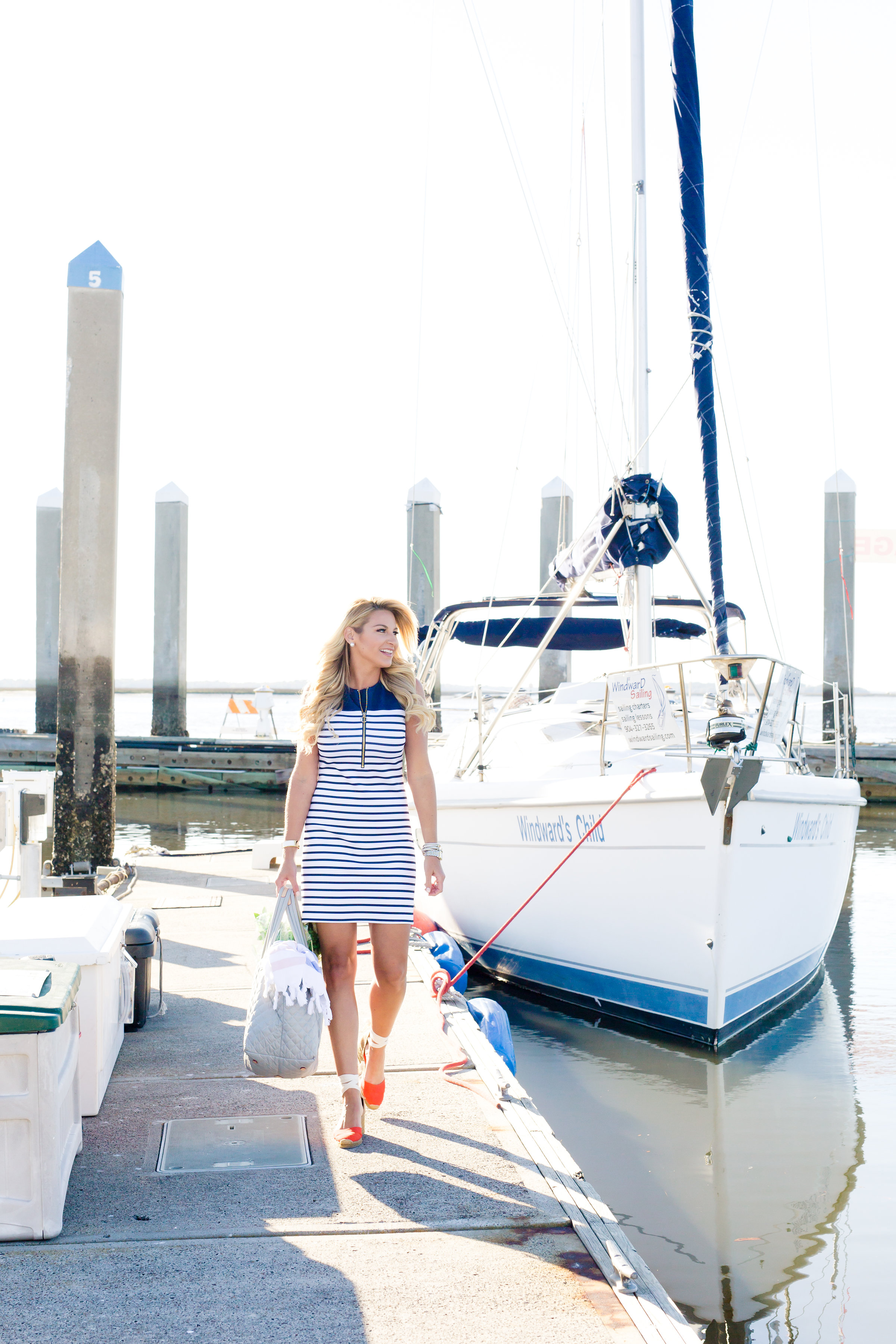 Dress : Michael Kors Norwood Stripe Dress | Shoes : Washed Canvas Wedge Espadrilles | Nails : Essie White | Nars Lipstick Bag : Quilted Nylon Tote | Bracelets : David Yurman (7 stacked 5mm : shop them all here) | Nordstrom | Watch : MICHELE Diamond Dial Two-Tone Watch | Ring : Cartier and David Yurman Ring