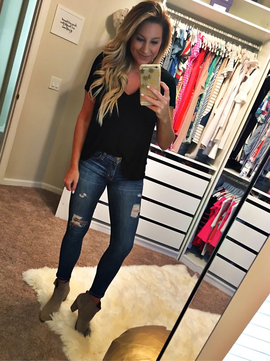 I am wearing the v neck tee shirt in a size Small that comes in like 6 colors with the Current Elliott Stilletto Jean (mine are the distressed but the non distressed is in the sale) and these booties.