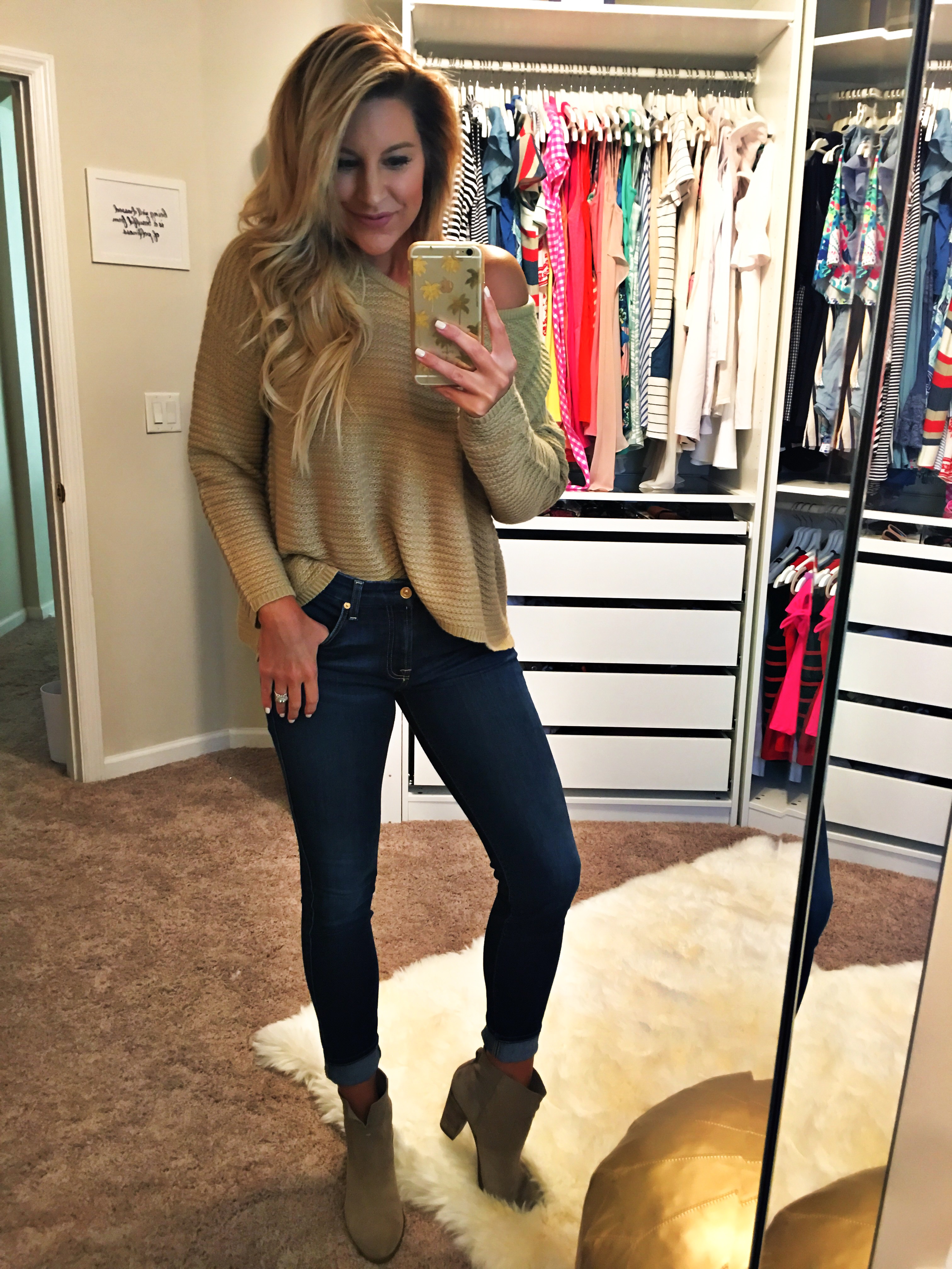 I am wearing this thermal top in a size medium but pulled it off my shoulder with my favorite 7 Air Jeans and the slit booties in the shade taupe.