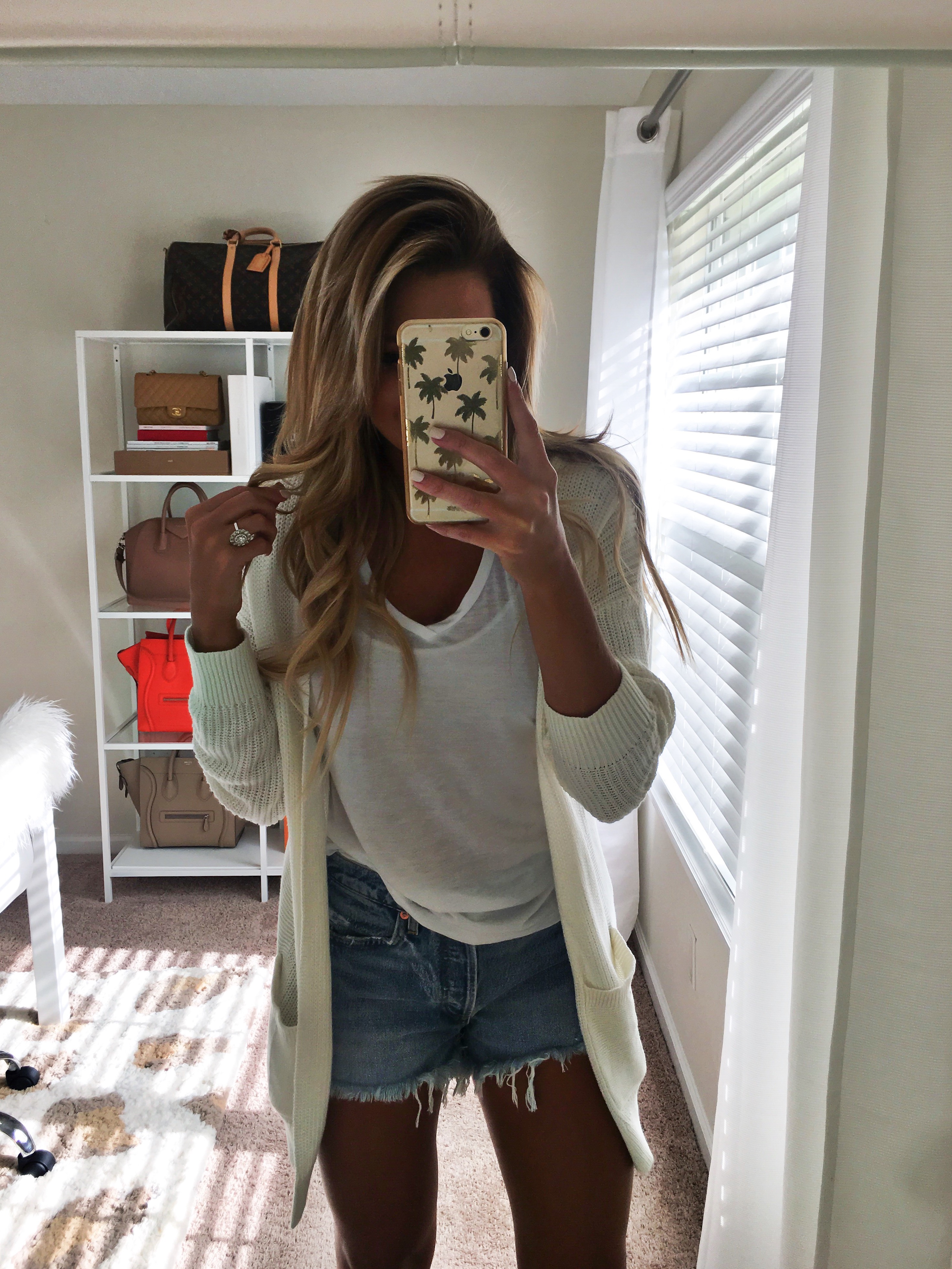 The split high neck tunic in a size Small with the cocoon cardigan in shade tan heather in size XS with my favorite jean shorts (size down) and the slit booties in the shade taupe.