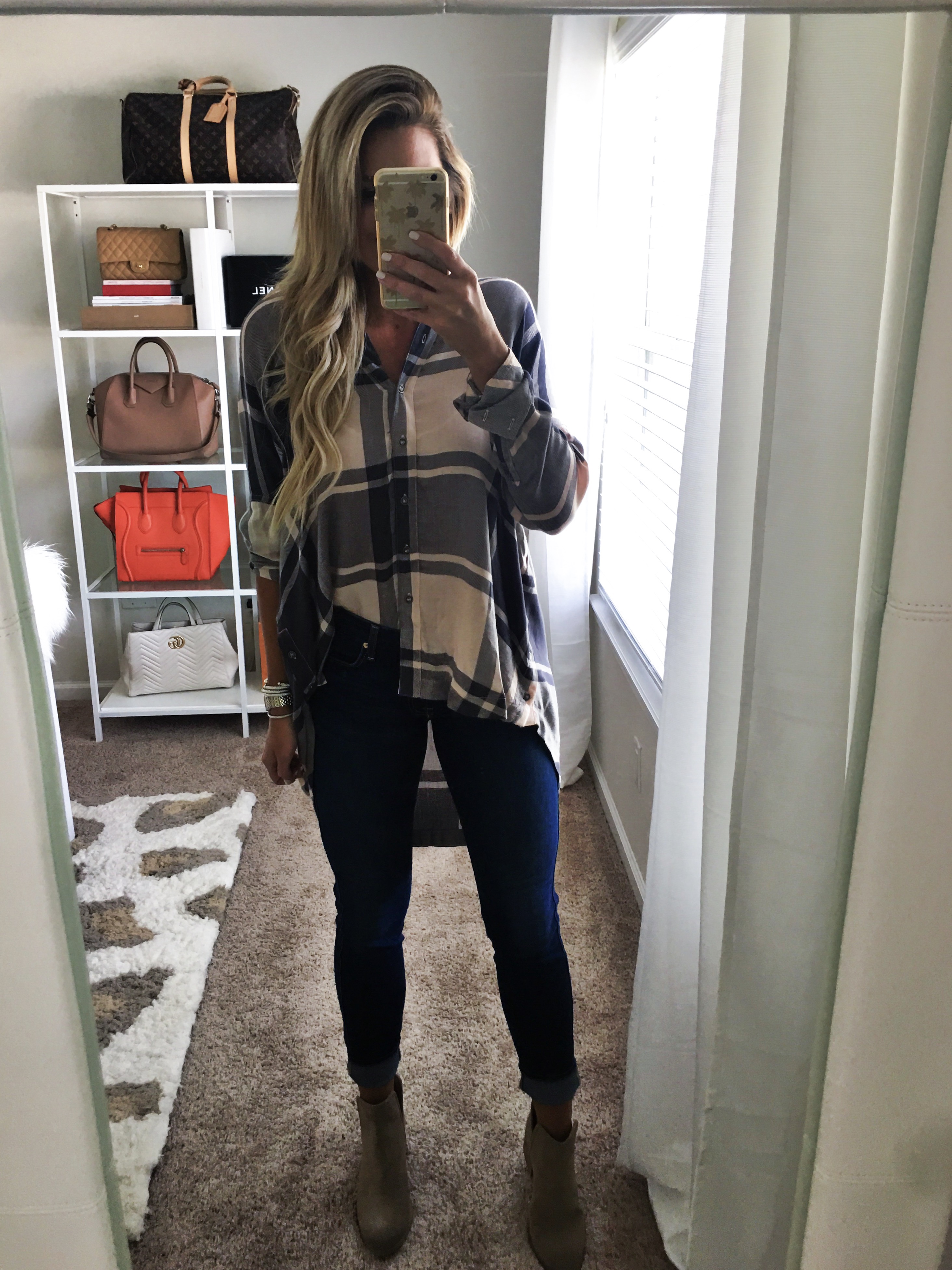 I am wearing this amazing plaid tunic top in a size extra small with my favorite 7 Air Jeans and the slit booties in the shade taupe.
