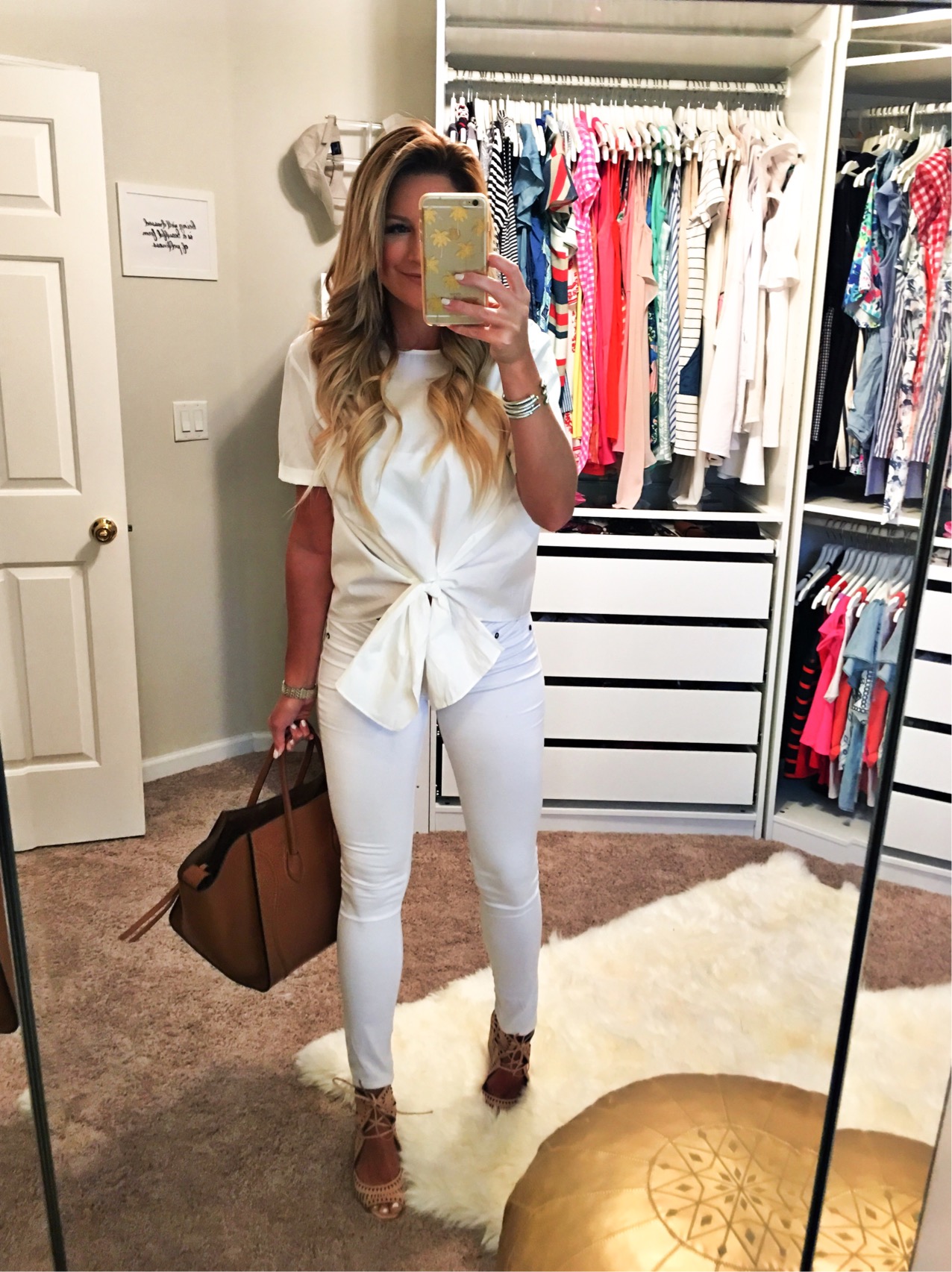 I am wearing the cutest bow tie front top in a size Small that comes in the cutest stripe color as well with my CE White jeans and wedges (not included in sale).