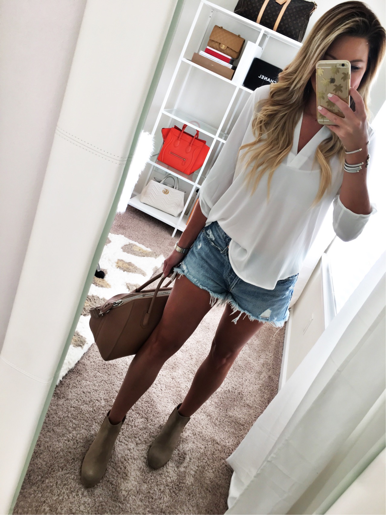 The the best long sleeved tunic in a size Small that comes in 9 other colors with my favorite jean shorts (size down) and the slit booties in the shade taupe.