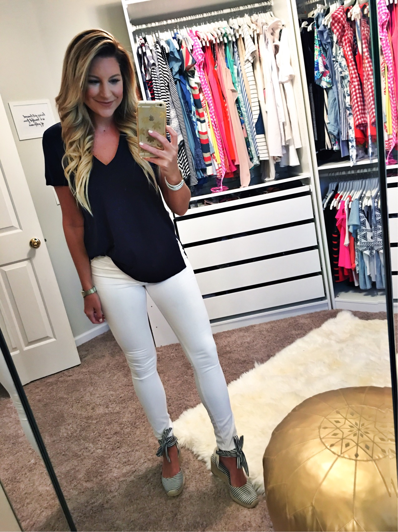 I am wearing my favorite slit v neck tee in a size Small that comes in the cutest stripe color as well with my CE White jeans and wedges (not included in sale).