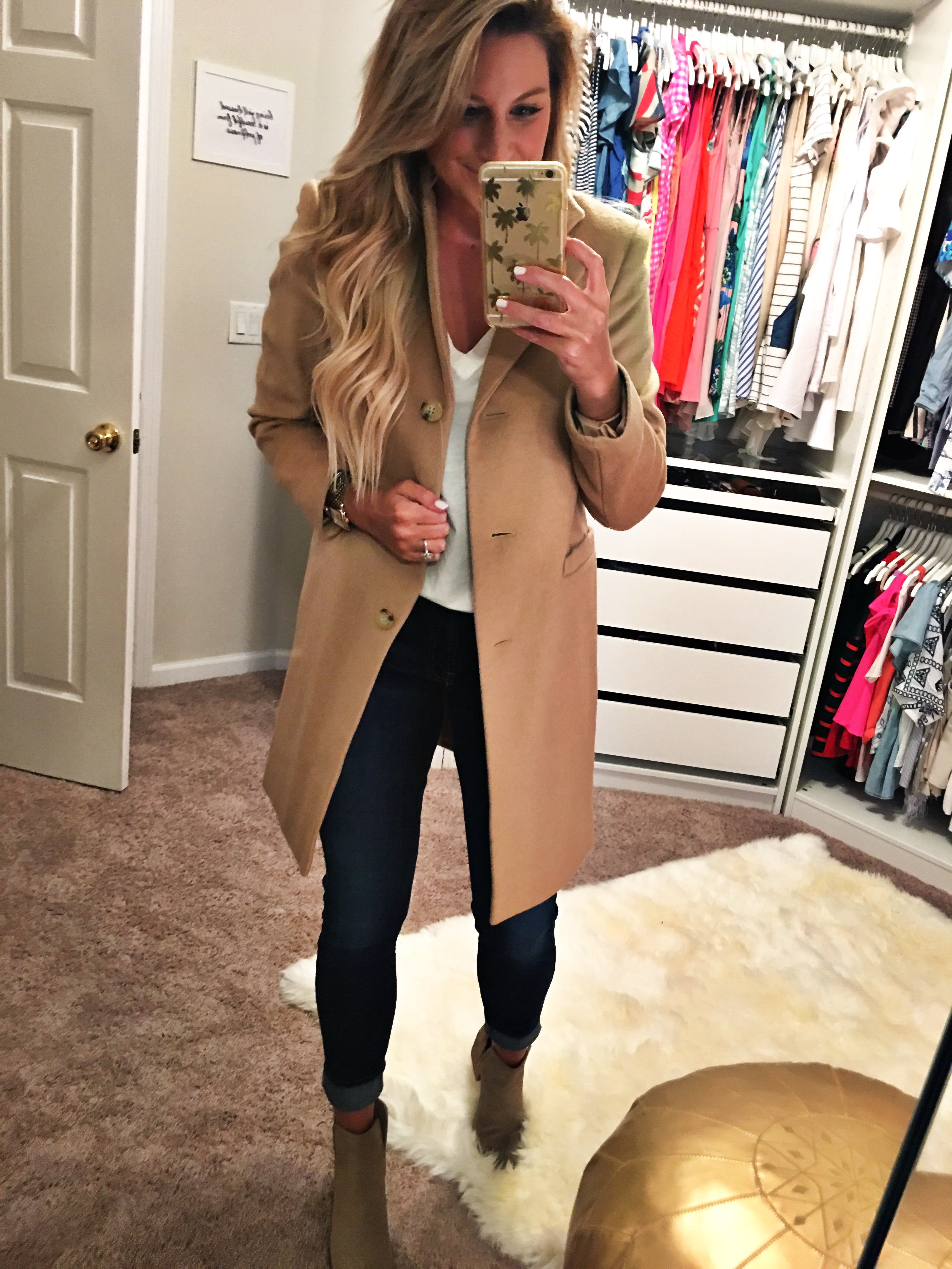 I am wearing my favorite slit v neck tee with this amazing Camel Reffer Coat in a size 4 that is only $139 in the sale with my favorite 7 Air Jeans and the slit booties in the shade taupe.