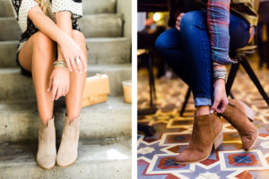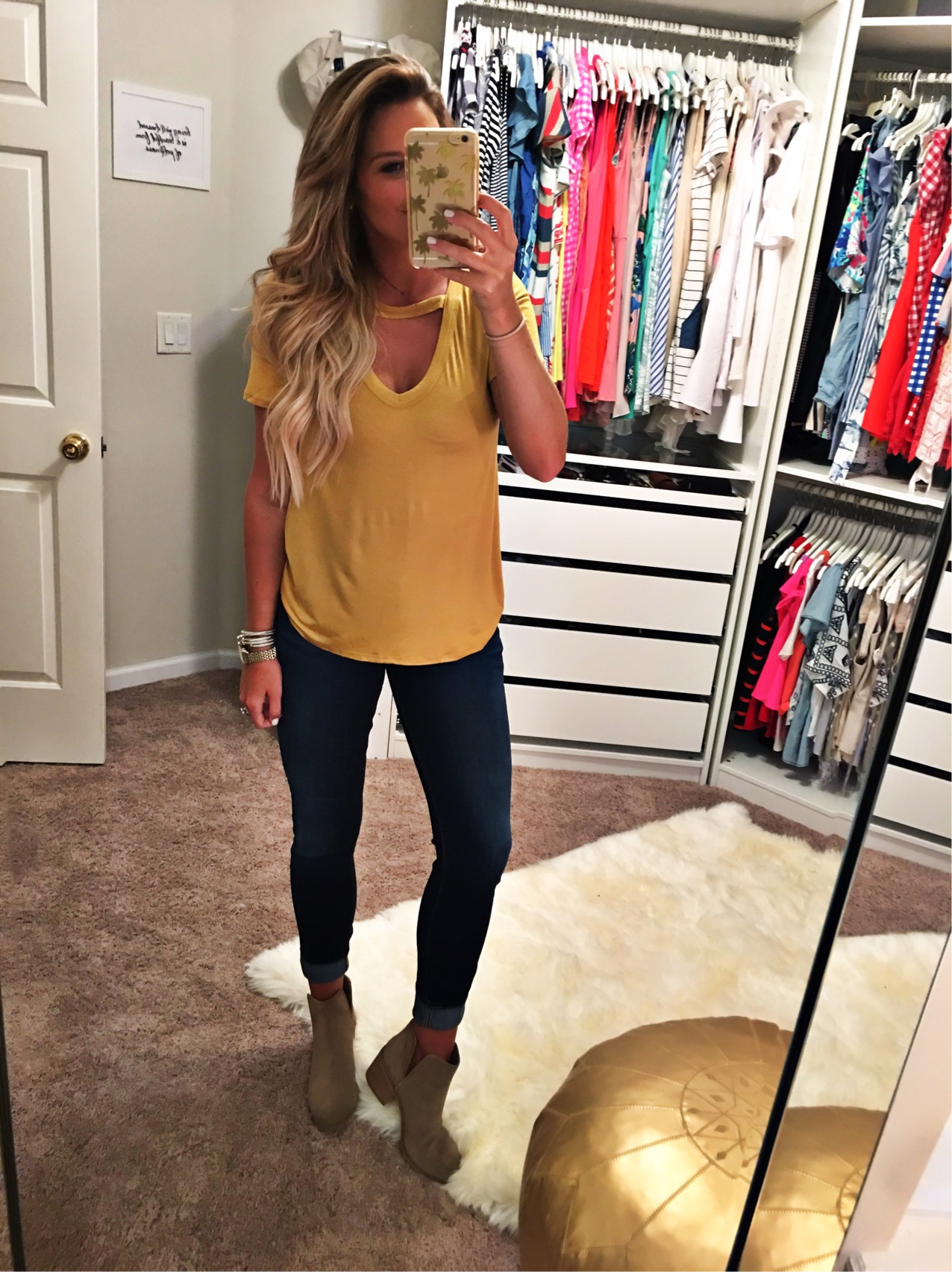 I am wearing my cut out choker neck tee in size small with my favorite 7 Air Jeans and the slit booties in the shade taupe.