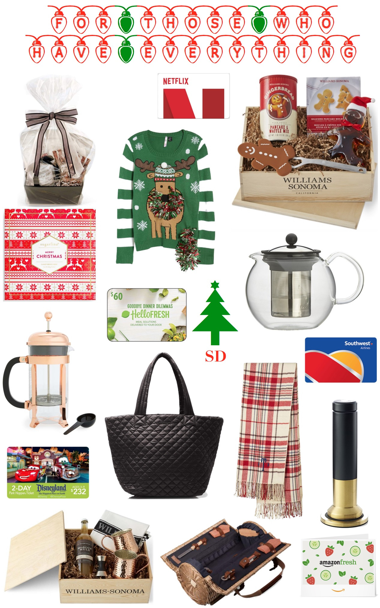 This gift guide took a lot of extra thought. We tried to think really hard and be creative to help you out for the person in your life who has everything. Maybe it’s your in-laws or your boss. You could give a unique gift card like Disney passes or a travel airline gift card. Maybe a funny ugly Christmas sweater. You could give them a monthly fresh grocery box like Hello Fresh or Amazon Prime. Or just snag a pre-made gift basket or box and send it right over! Click a product in the image to check out the item or scroll left to right below. Shop all Gift Guides here or visit the Christmas Shop for more.