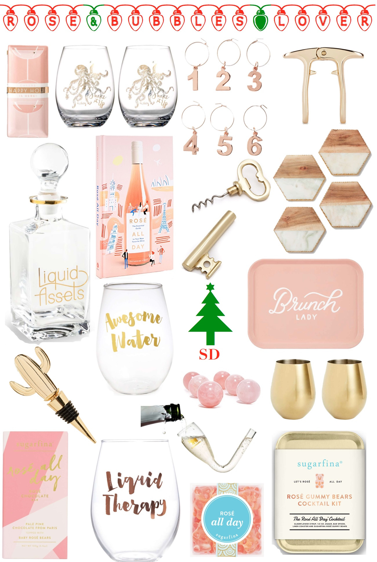 This gift guide was so fun to put together, yes way rosé! It made we want to pop open a bottle of Rosé! These gifts are perfect for any fun free spirited drinking friend in your life who loves to drink a glass of wine or Rosé! Click a product in the image above to shop an item or scroll left to right below!