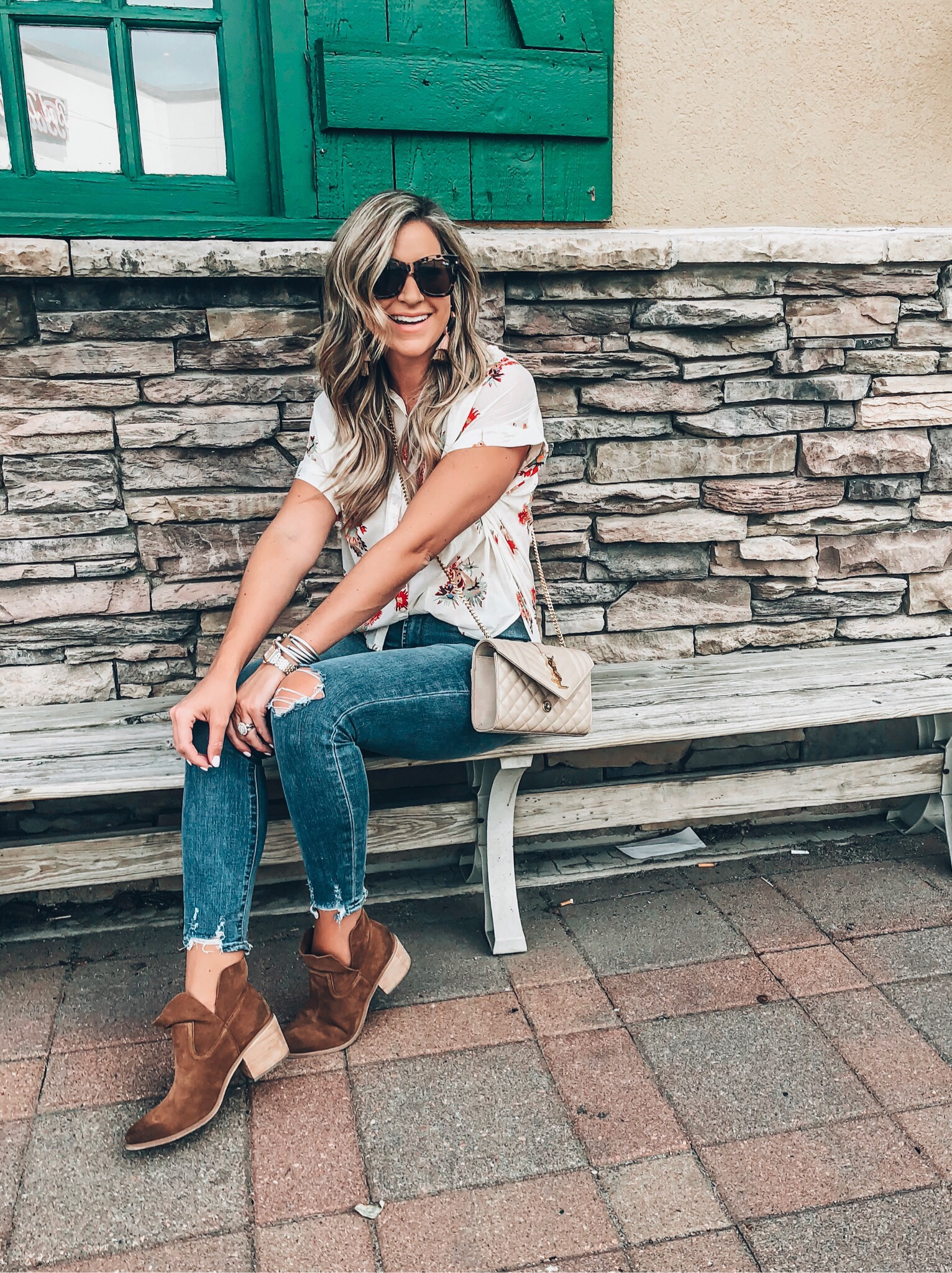 Details: Madewell Button Down Print Top (wearing size small, runs true to size) $47.90, Articles of Society Heather Distressed Ankle Skinny Jeans on sale for $44 (have a great stretch I love the rip ankle raw hem & run true to size) with BP Brice Notched Ankle Booties $79.90 (run true to size I got my true 9)