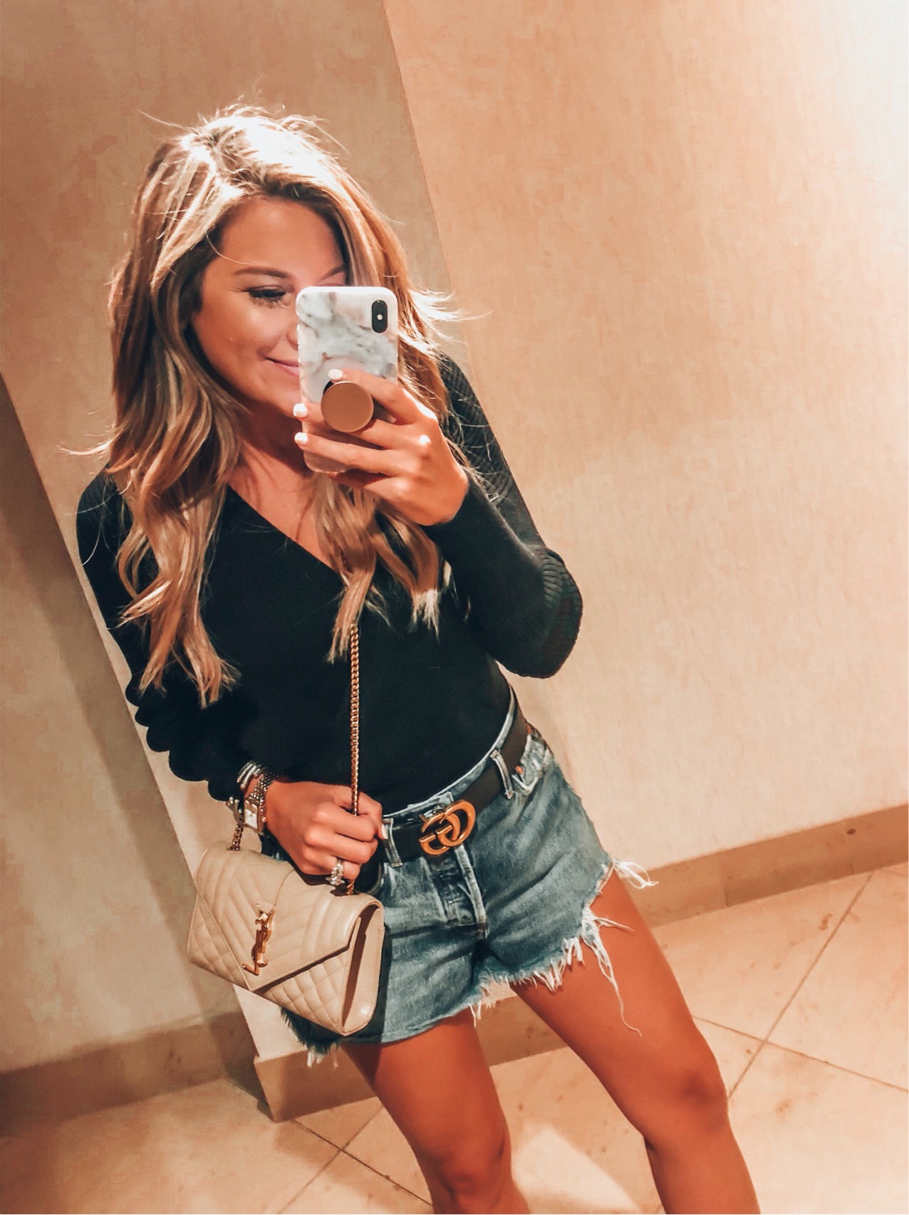 Details: Leith Rib Wrap Sweater size small, runs true to size $39.90, Parker Distressed Shorts, YSL Cassandre Bag.