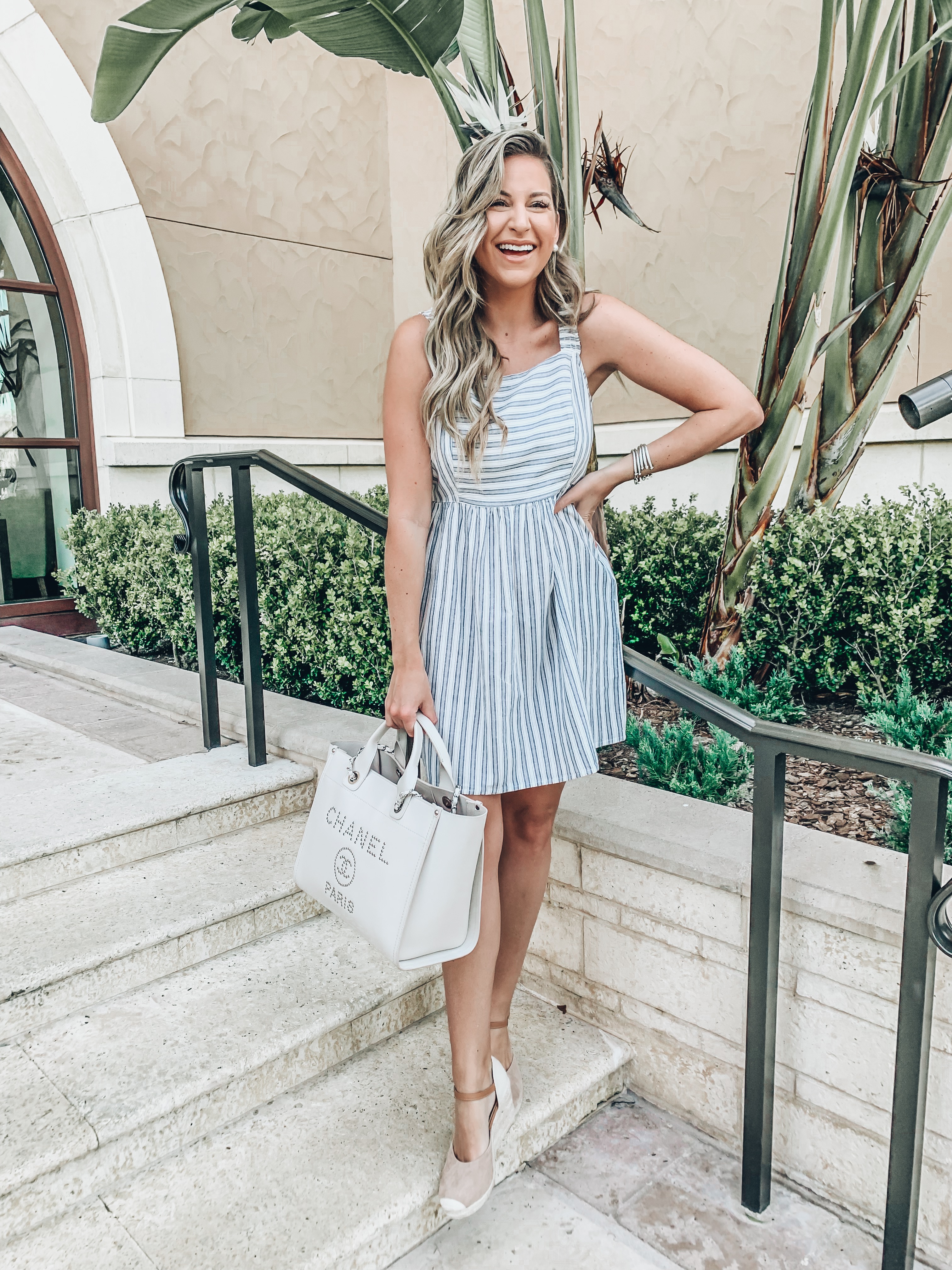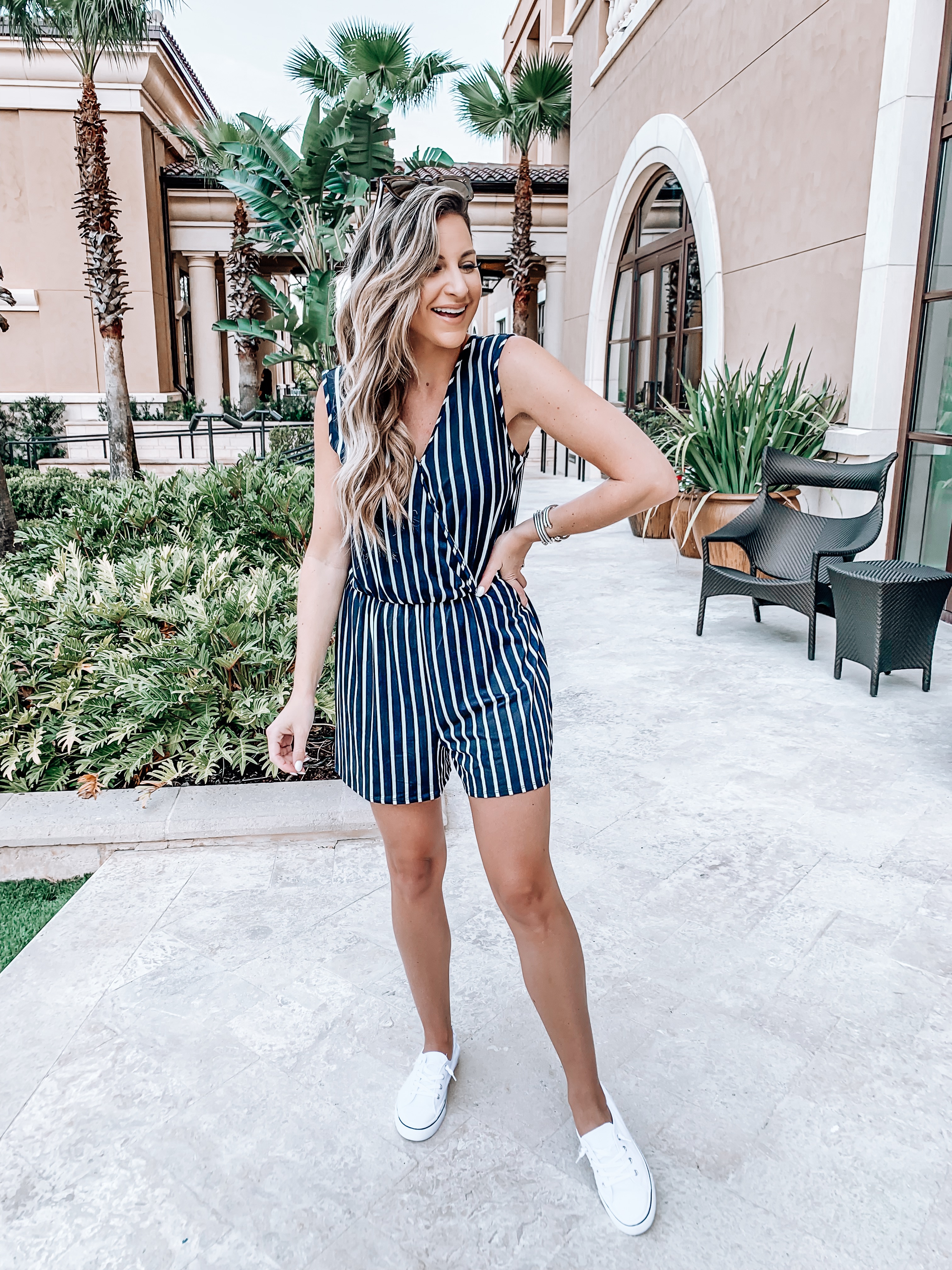 I have been trying to find some new places to shop for cute and affordable spring pieces to add to my closet that are great quality, enter Walmart! This navy and white stripe romper I snagged is so dang cute, I will be living in this piece all spring. It was really warm in Orlando on our trip this week and I didn’t need a jacket, but I can’t wait to pair this cute romper with a jean jacket! I am wearing a size medium in the romper but it’s a bit big on me, I should of gotten my true size small. The blue and white stripe cinched dress is also a really cute addition to my everyday wardrobe. I dressed it up with wedges, but you could totally dress it down with the same sneakers I wore in the stripe romper.