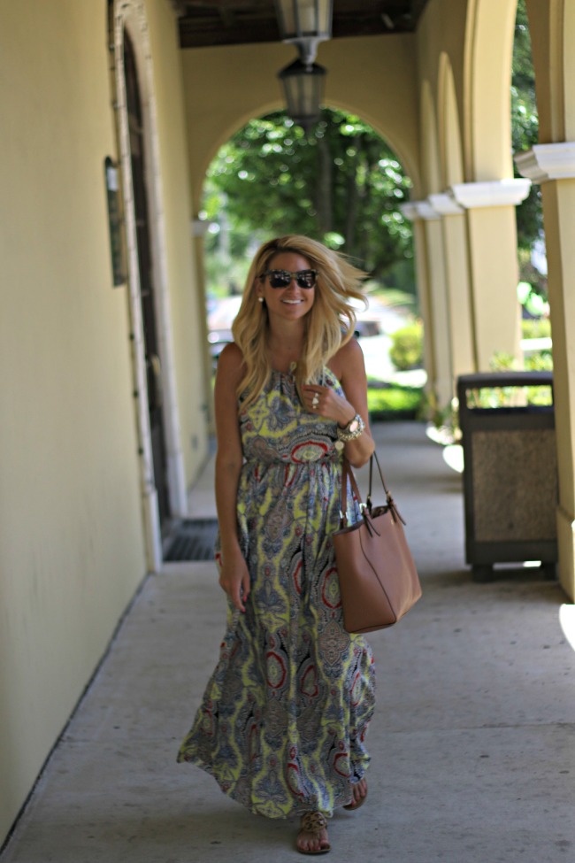 Dress : Lola Printed Woven Maxi (only $35) | Sandals : Tory Burch Miller Sandal | Bag : Tory Burch York Tote | Sunglasses : Karen Walker | Bracelets : David Yurman | Nordstrom | Earring : Pearl Stud | Ring : Kendra Scott Two Finger Ring