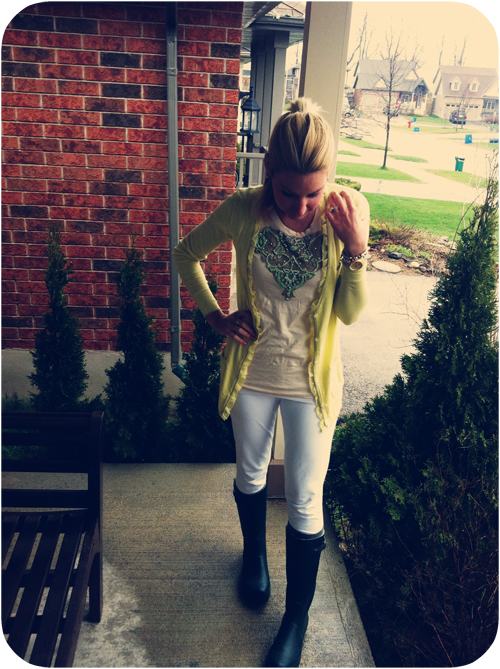 This rain and cold weather has taken over spring. Seeing everyone else frolicking around in sunny warm weather is no fun. It has been raining all spring. I feel like I have worn out my wellies. Today I decided to throw on a fun color for spring to try to trick myself into liking the weather. The pretty light green-yellow color of my ruffle cardigan made me smile. I mixed it with my embellished tee for the mix of the two styles. I put on my go-to white skinny jeans and wellies for the down pour rain today. The hair was a must do pony tail. I just knew I was going to get soaked and I can not handle wet hair in my face. Enjoy my outfit of the day with the outfit details below photos.
