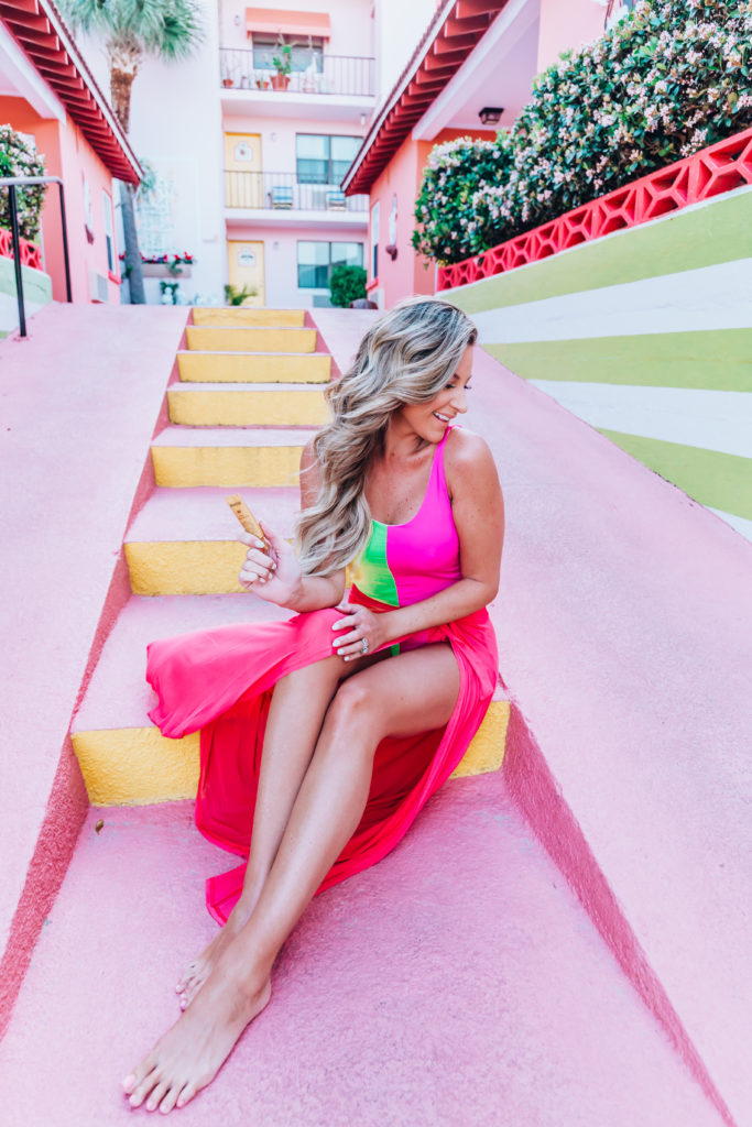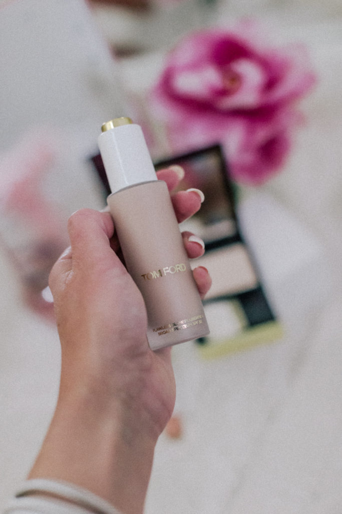 Tom Ford Soleil Flawless Glow Foundation with SPF 3o applied with their #1 foundation makeup brush and set with their translucent finishing powder in shade alabaster nude. Wearing thew new Soleil Liquid Lip Tint in shade Naked Elixir in this darling rainbow printed Moon River Dress.