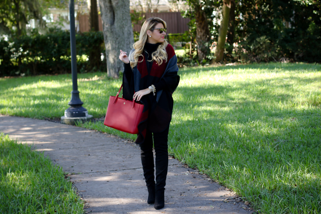 Ponte Pants : Women’s Topshop Seamed Ponte Knit Leggings | Sweater : Chelsea28 Turtleneck Sweater | Cape : Chicwish Wine Colored Colorblock Cape Boots : Women’s Steve Madden ‘Gorgeous’ Over the Knee Boot | Bag : Tory Burch York Tote in Red | Sunglasses : Prada 56mm Sunglasses | Bracelets : David Yurman | Nordstrom | Watch : Daniel Wellington Watch | Earring : Pearl Stud | Ring : David Yurman Ring & Bauble Bar