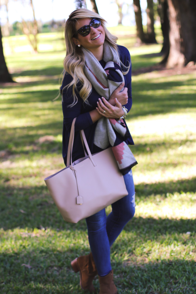 Jeans : Current Elliott Stiletto Jean | Shirt : Necessary Clothing Piko Tunic | Scarf : Geo Print Chicwish Scarf | Boots : Dolce Vita Grayden Western Bootie | Bag : Tory Burch Marion Quilted Handbag in Red Agate | Sunglasses : Prada 56mm Sunglasses | Bracelets : David Yurman | Nordstrom | Watch : Daniel Wellington Watch | Earring : Pearl Stud | Ring : David Yurman Ring & Bauble Bar
