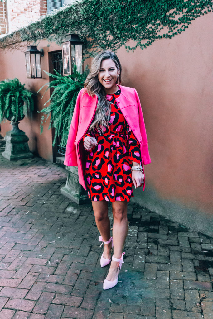 Dress : Asos Pink & Red Leopard Dress | Coat : Amazon Wool Coat in Pink | Bag : Gucci Disco Soho | Watch : VE Rose Gold watch | Sneakers : VE Crystal on howlite wrap bracelet.