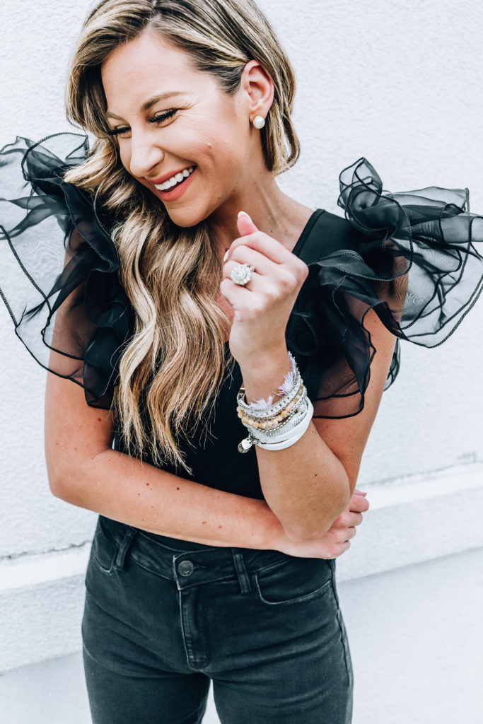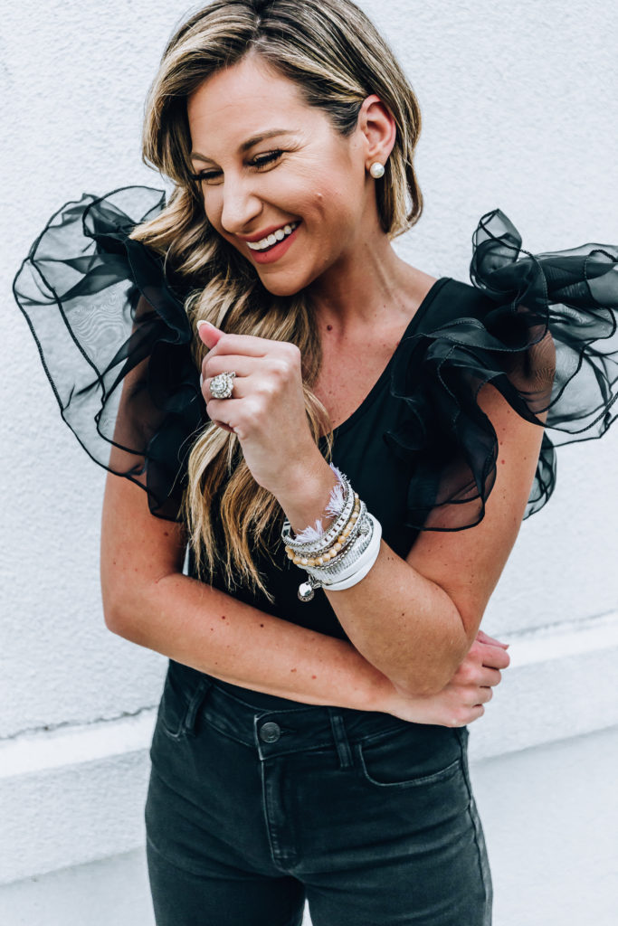 Top : Tulle Ruffle Mesh Bodysuit | Jeans : high waisted skinny jeans from American Eagle | Shoes : Steve Madden Sandals | Jewels : Santori Boho cuff and heart double wrap