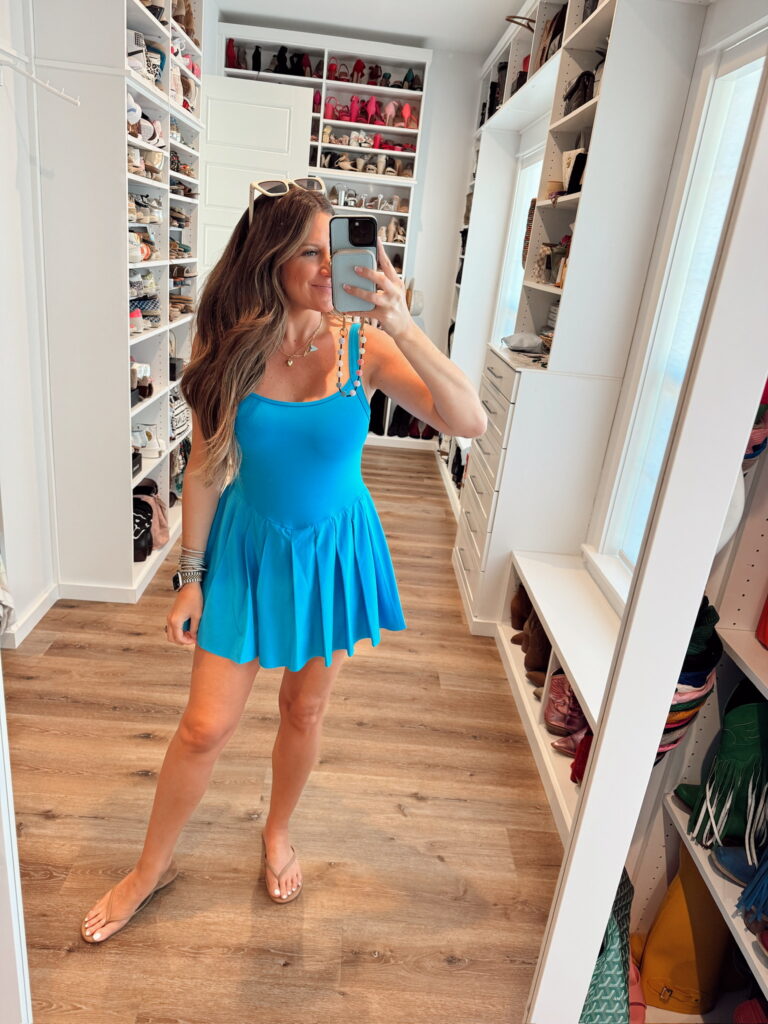 In a medium pleated bottom tennis dress, necklaces, sandals, sunglasses and accessories- all fits tts. Shop the items here!