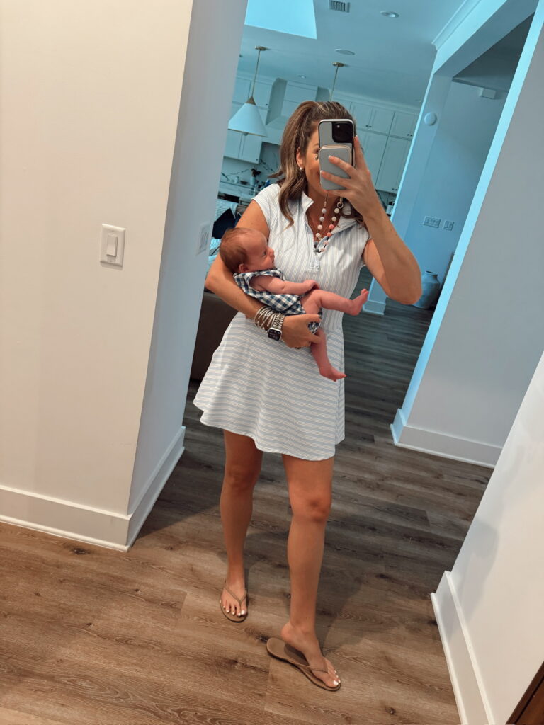 In a medium half zip knit sweater, large tennis dress, sandals and accessories – fits tts. Baby boy in the mabe carrier. Shop the items here!