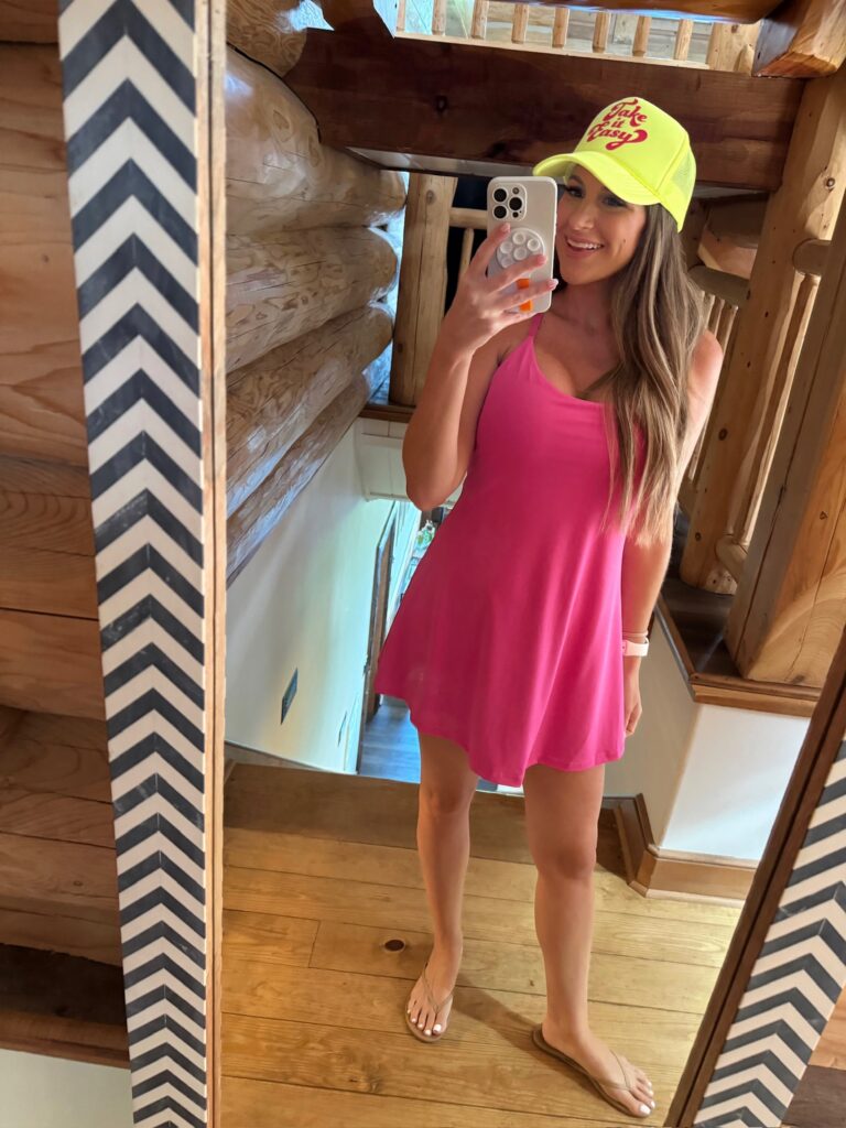 In a medium tennis dress with easy to remove built in shorts, trucker hat, sandals and accessories – all fits TTS.
