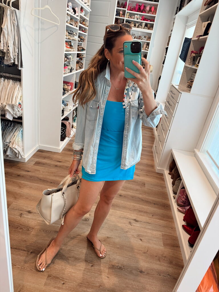 In a medium tennis dress, medium chambray shirt, sandals and accessories – fits tts. Shop the items here!