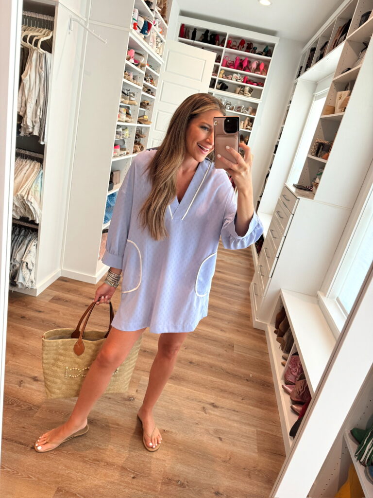 In a medium 3/4 sleeve v neck dress, sandals, tote and accessories – all fits TTS.
