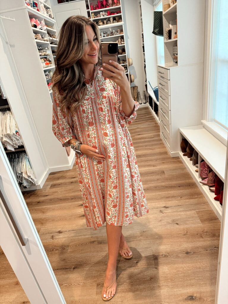 In a medium Farm Rio x Anthropologie Long-Sleeve Printed Maxi Dress sandals and accessories- all fits TTS.