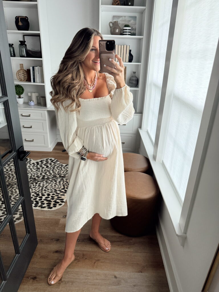 In a small muslin puff sleeve smocked top midi, sandals, necklaces and accessories – all fits TTS.