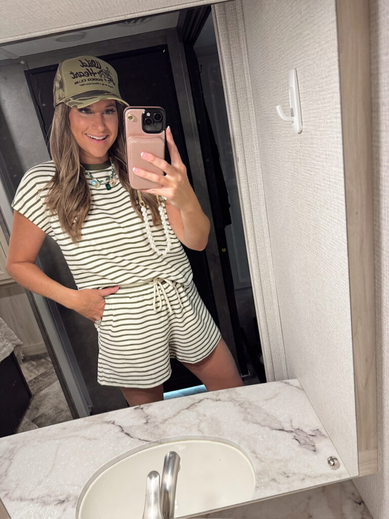 Camping ootd! In a medium 2 piece lounge set, necklace, hat and accessories- fits tts. Shop the items here!